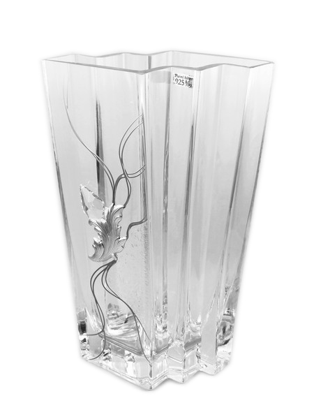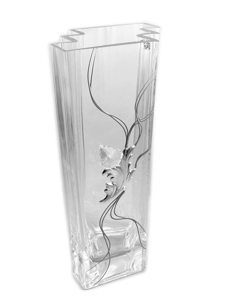 Wazon szklany zdobiony z serii Alicja z kryształem i srebrnym liściem z grawerem dedykacji.