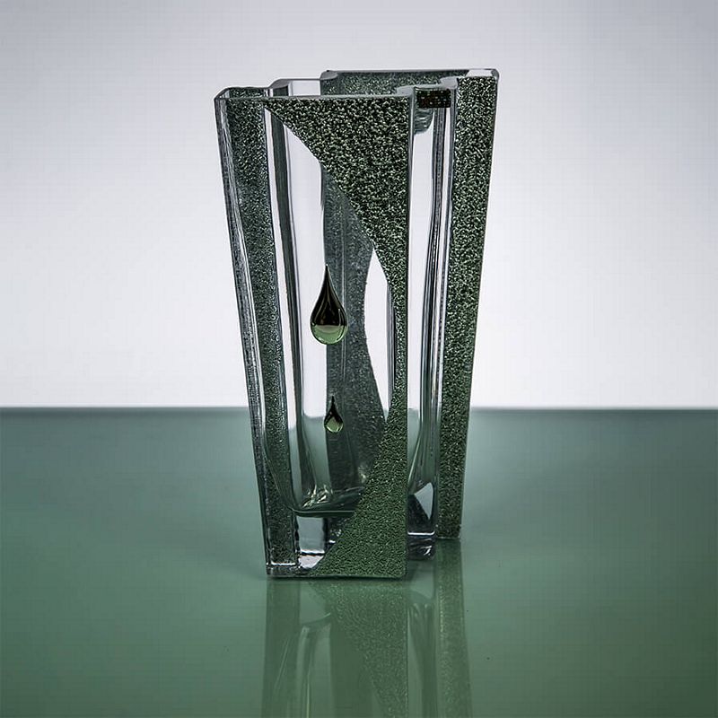 Ręcznie formowany, niepowtarzalny szklany wazon w prostokątnym kształcie z bocznymi schodkami.