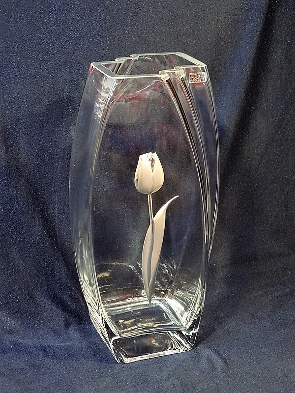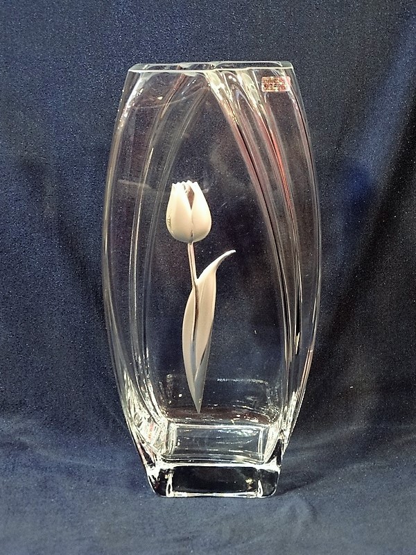 Dodatkowo w centralnej części wazonu umieszczony jest srebrny element w formie pięknego kwiatu tulipana.