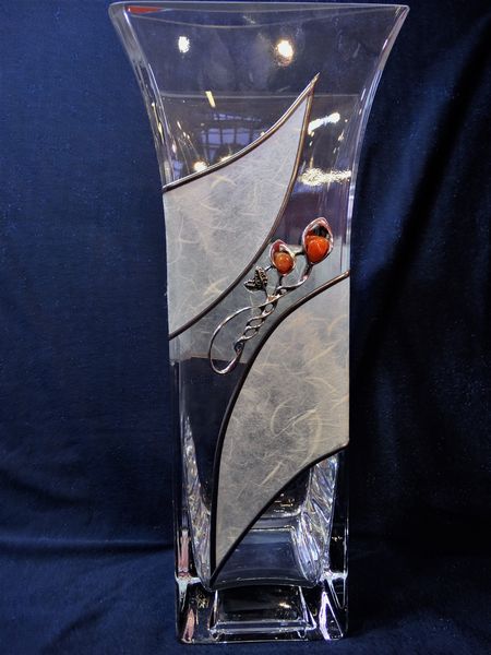 Elegancki wazon zdobiony jest metodą decoupage, metaloplastyką i naturalnym minerałem.