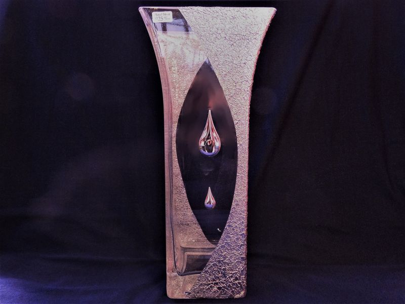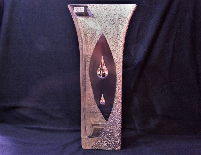 Elegancki wazon ozdobiony srebrem. Zdobienie jest z boku wazonu i przypomina pognieciony srebrny papier naklejony na szkle.