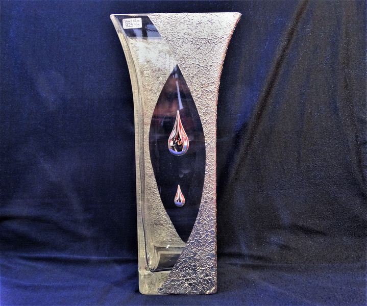 Niepowtarzalny, ręcznie formowany, zdobiony wazon szklany w kształcie wydłużonego lejka.
