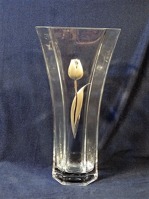 Elegancki wazon ozdobiony srebrem. Dodatkowo w centralnej części wazonu umieszczony jest srebrny duży tulipan.