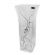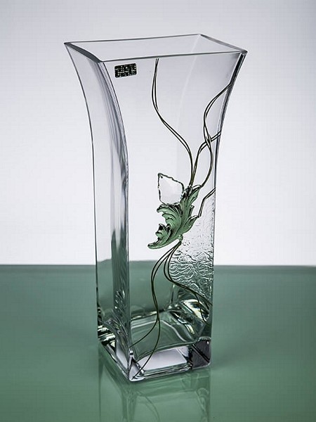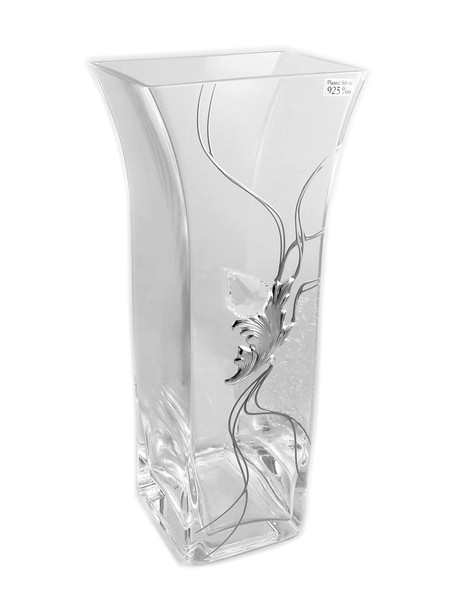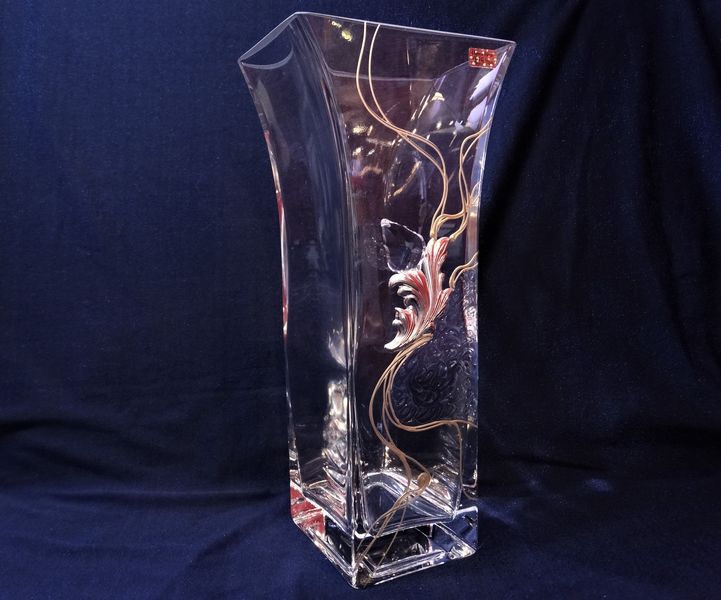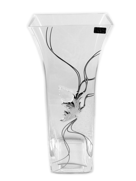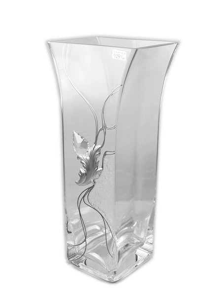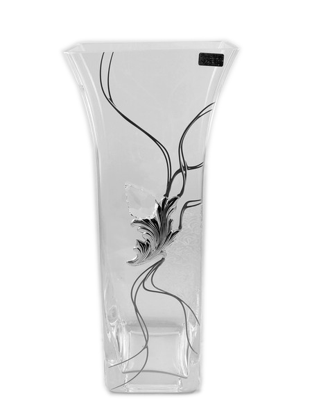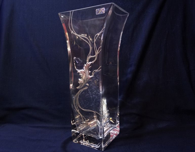 Na wazonie umieszczony jest centralnie efektowny kryształ połączony z srebrnym liściem oraz przezroczystym motywem roślinnym, który wygląda jak zatopiony i malowany na szkle.