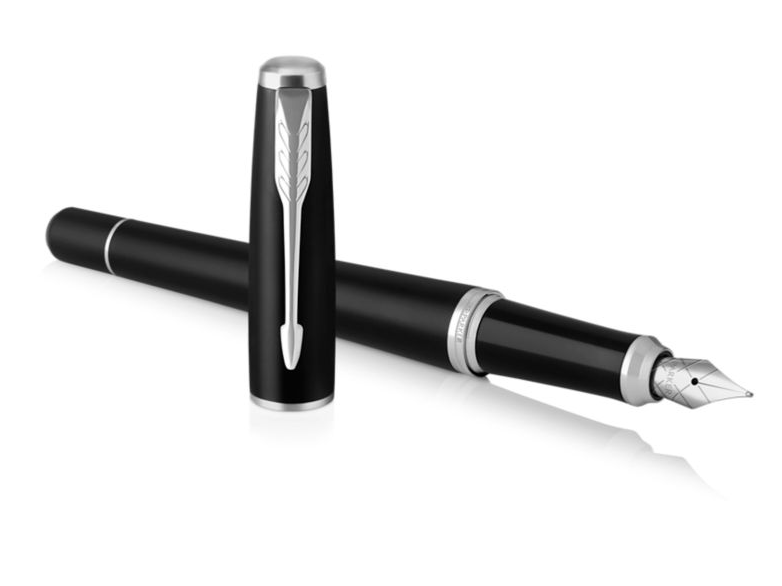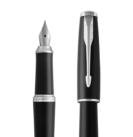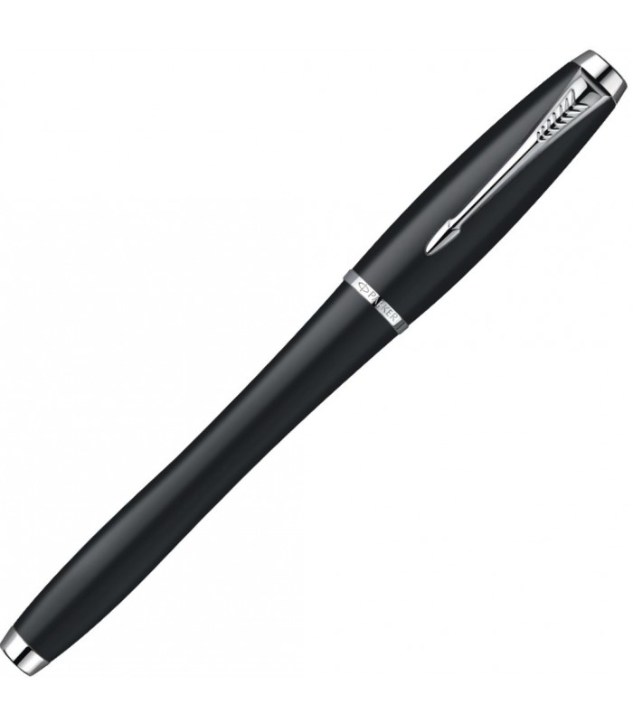 Gustowne pióro wieczne Parker Urban łączy prostotę matowego czarnego koloru z wyrafinowanym kształtem oraz chromowanymi wykończeniami. Matowo czarny lakier o proszkowej powierzchni i polerowane wykończenia pierścieni podkreślają wysoką jakość produktu. Pierścienie wykonane są ze stali nierdzewnej, wykończenia chromowane. Korpus i nasadka wykonane z mosiądzu lakierowane czarnym lakierem. Sekcja przednia wykonana z czarnego tworzywa sztucznego i polerowana.