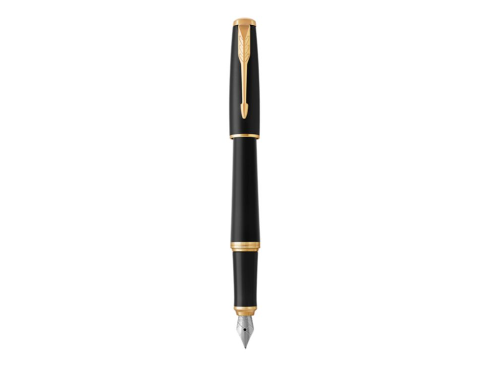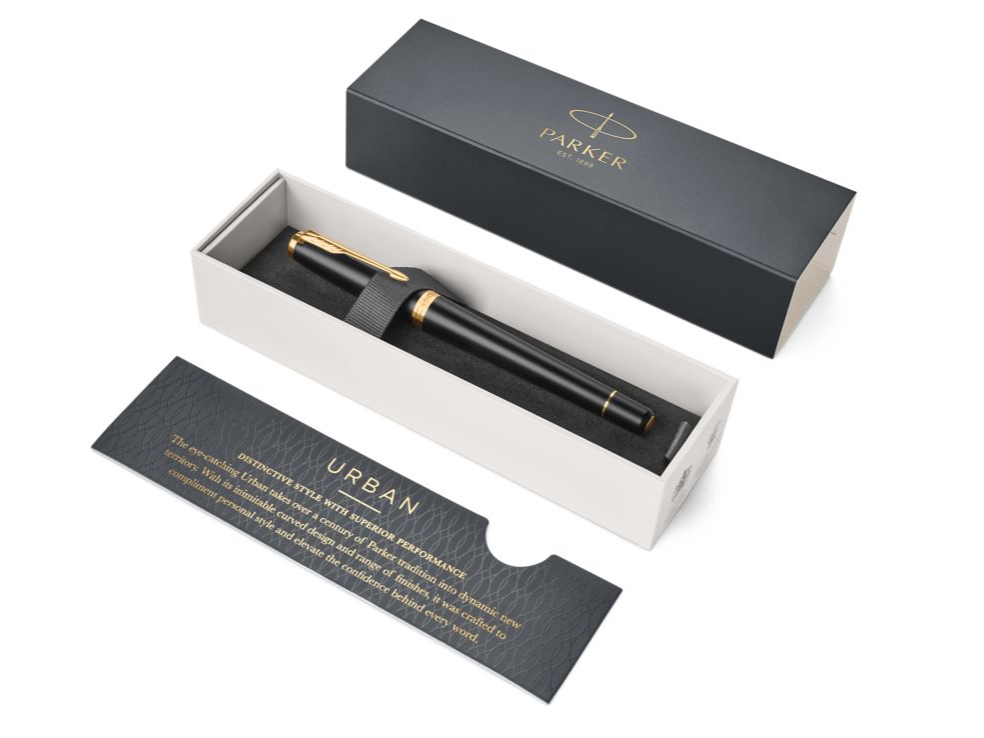 Gustowne pióro wieczne Parker Urban łączy prostotę matowego czarnego koloru z wyrafinowanym kształtem oraz złotymi wykończeniami. Matowo czarny lakier o proszkowej powierzchni i polerowane wykończenia pierścieni podkreślają wysoką jakość produktu.