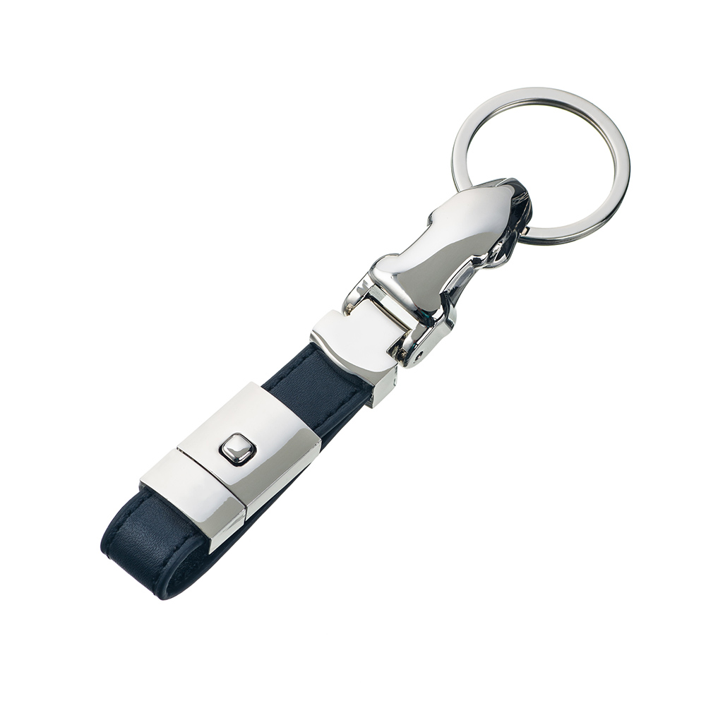 Brelok metalowo-skórzany z czarnym paskiem, zatrzaskiwany.