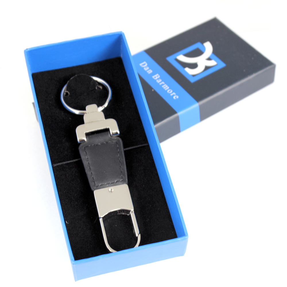Brelok metalowo-skórzany, dwustronny, srebrno-czarny, z kółkiem i karabińczykiem.