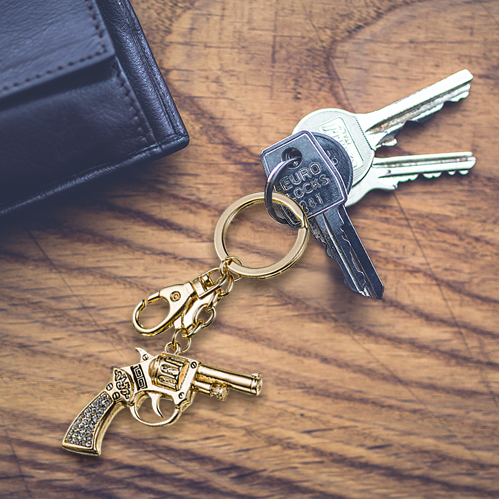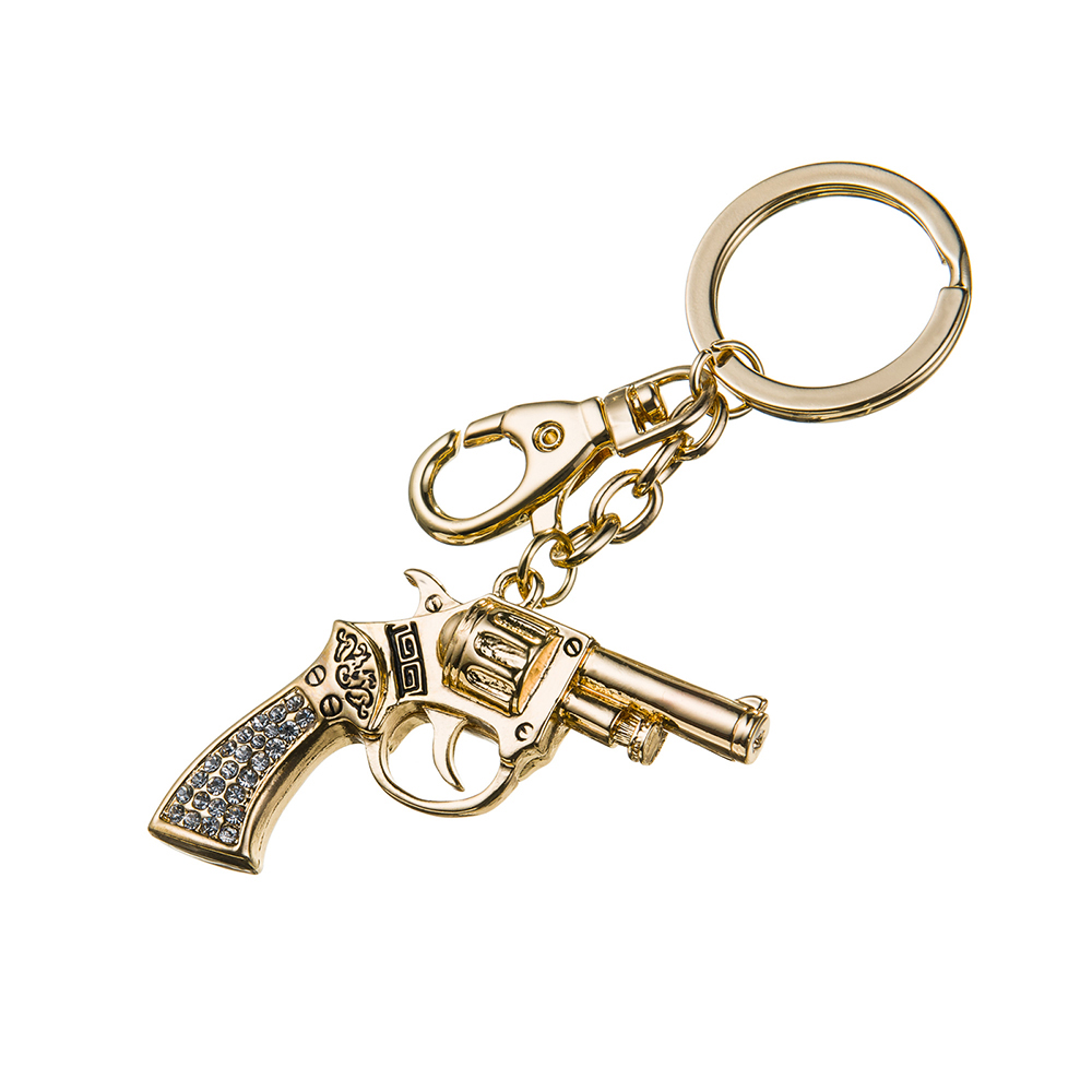 Brelok metalowy w kształcie pistoletu ozdobionego kryształkami.