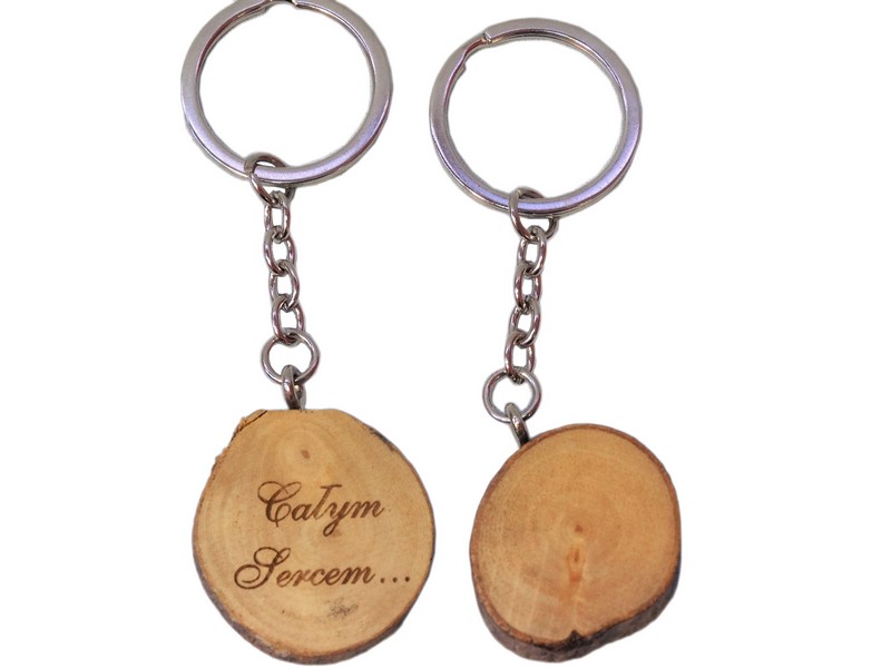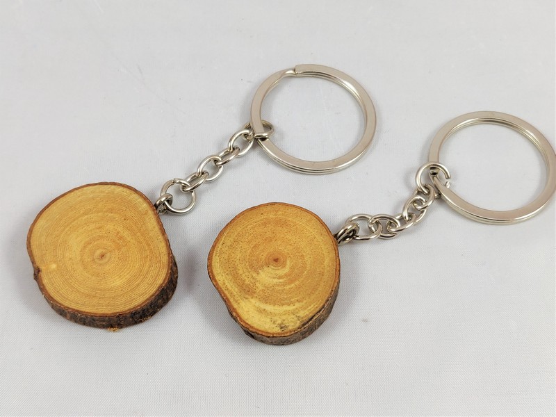 Wyjątkowy breloczek do kluczy, gdzie w formie przywieszki zastosowano przecięty poprzecznie kawałek drewnianej gałęzi.