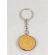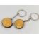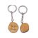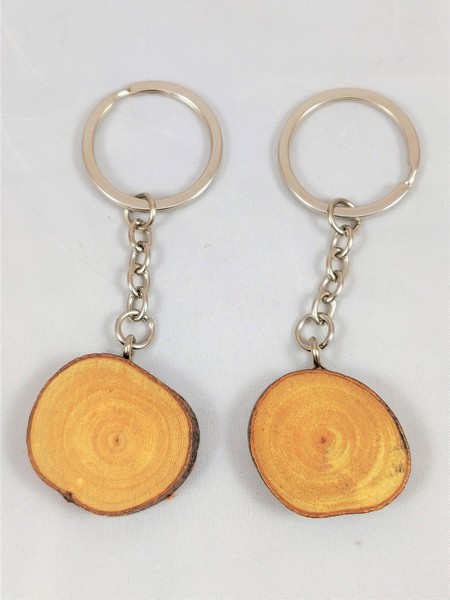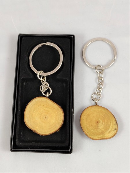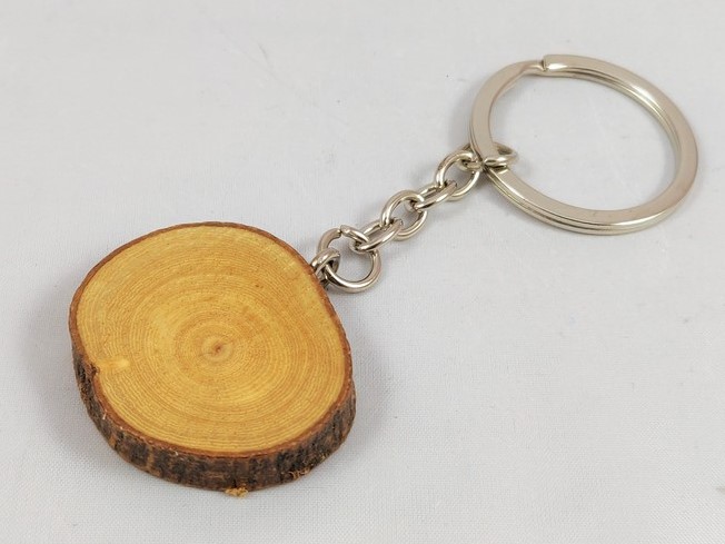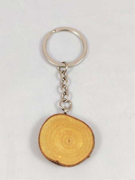 Drewniany brelok do kluczy w naturalnym kształcie plastra drewna.