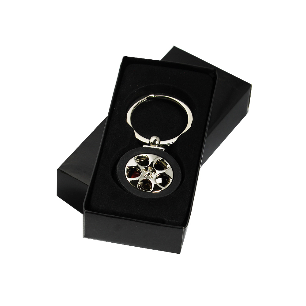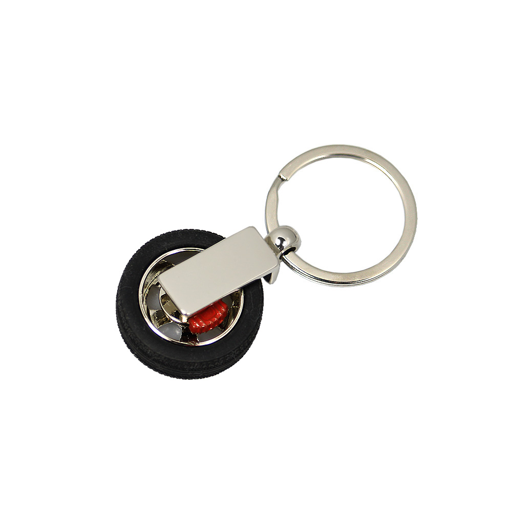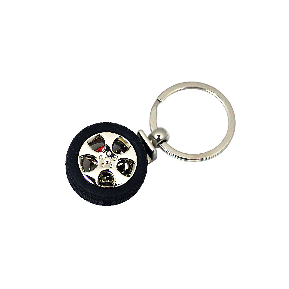 Metalowy obrotowy brelok do kluczy w formie koła samochodowego, zawieszony na kółku.