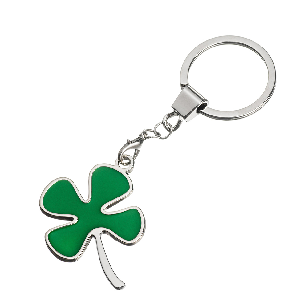 Brelok metalowy w kształcie czterolistnej koniczynki z możliwością graweru na odwrocie.