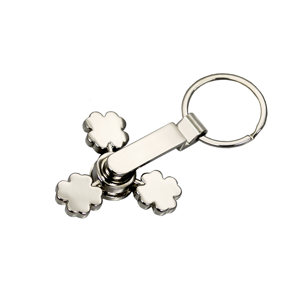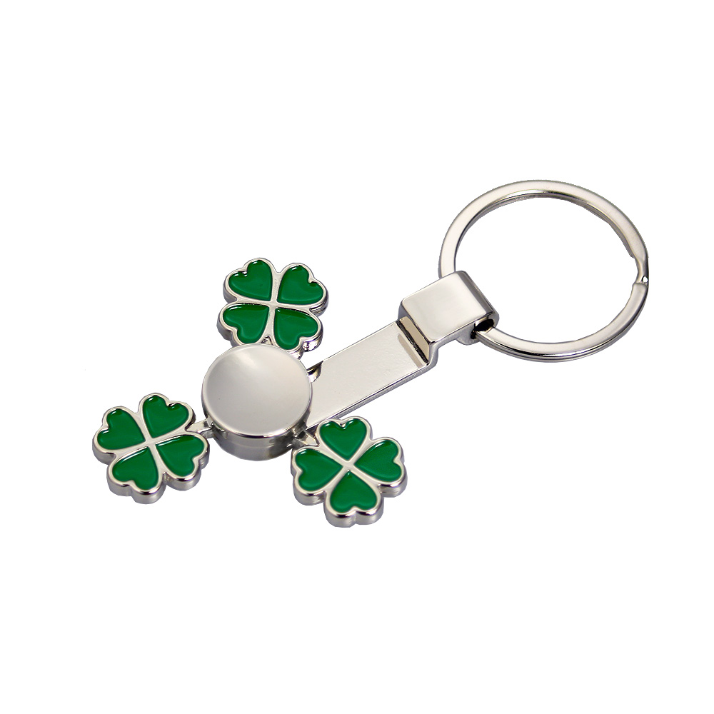 Metalowy brelok do kluczy z trzema zielonymi koniczynkami osadzonymi na obrotowym elemencie typu spinner.