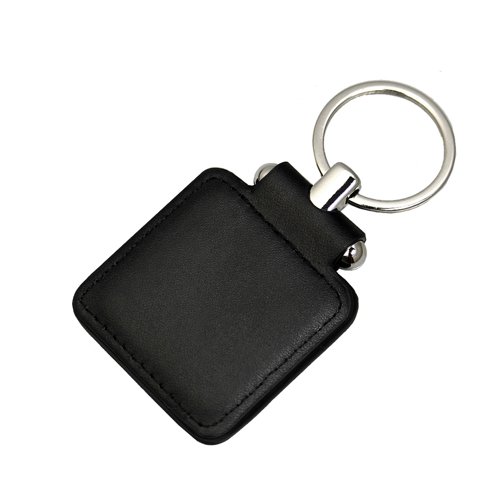 Metalowo-skóropodobny brelok do kluczy w kształcie kwadratowej przywieszki z emblematem w kształcie autka.