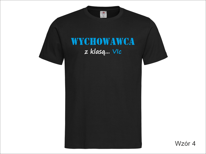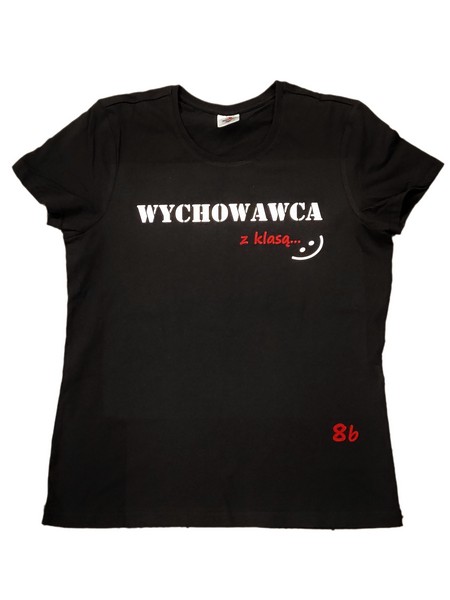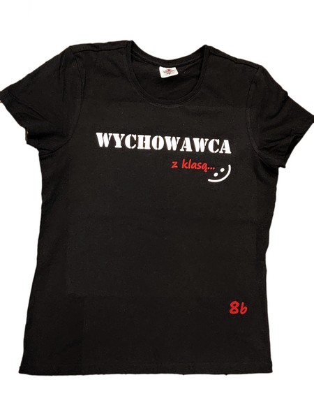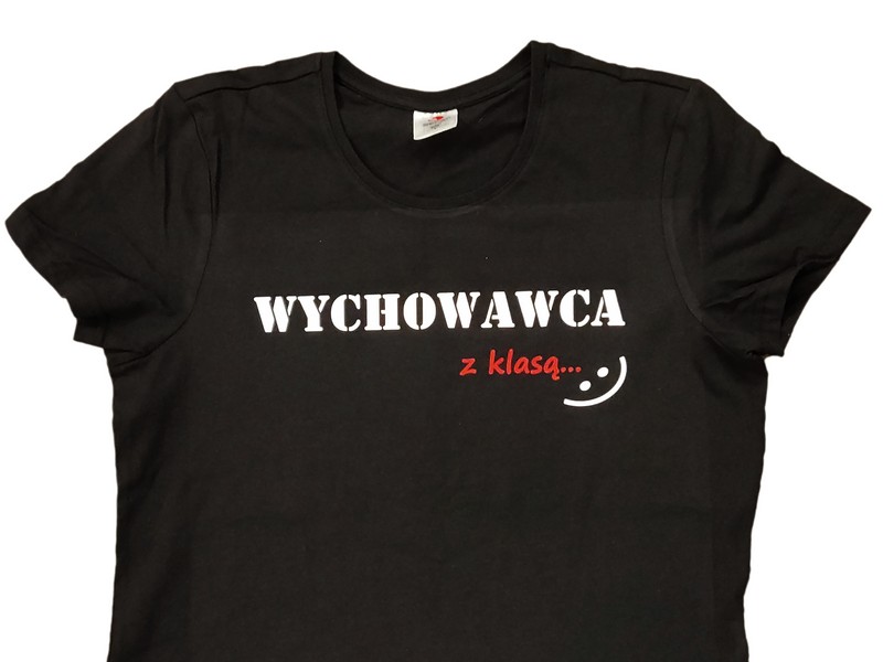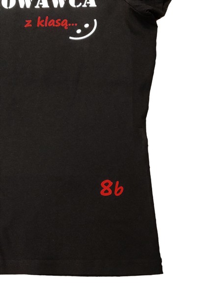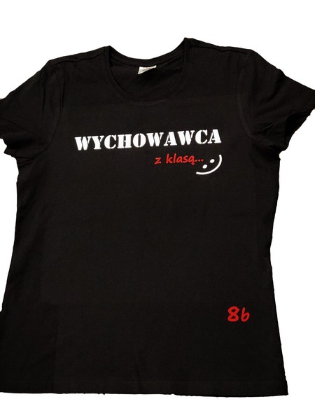 Na przodzie koszulki wykonany jest nadruk dedykacji dla nauczyciela, wychowawcy, belfra.