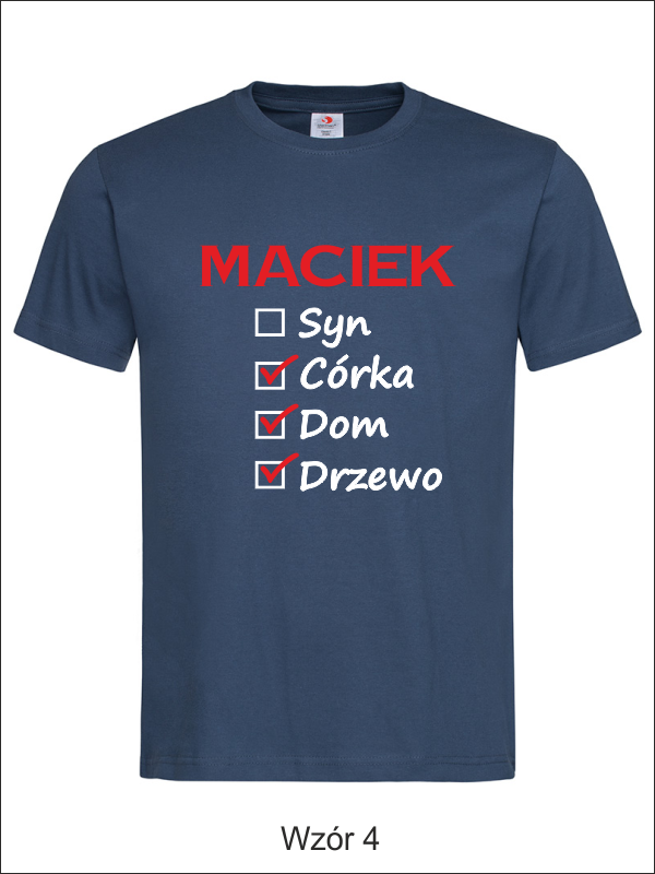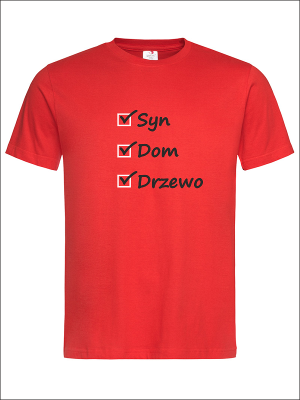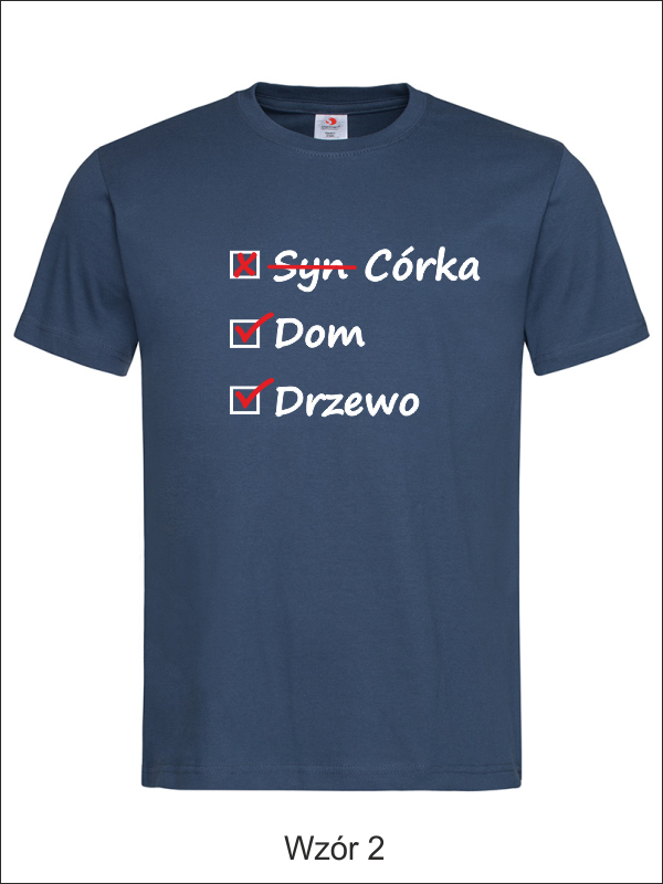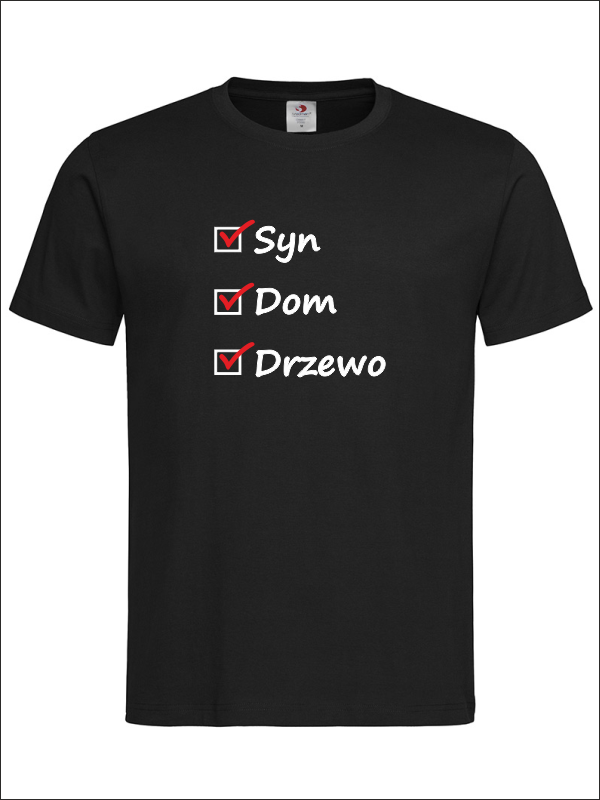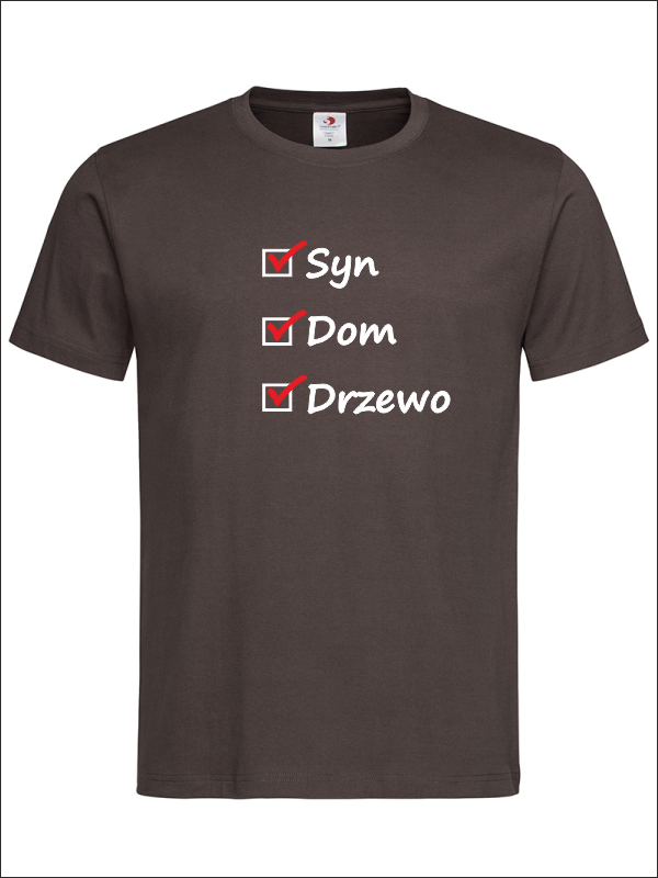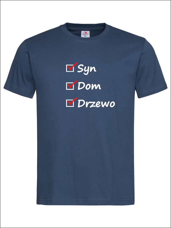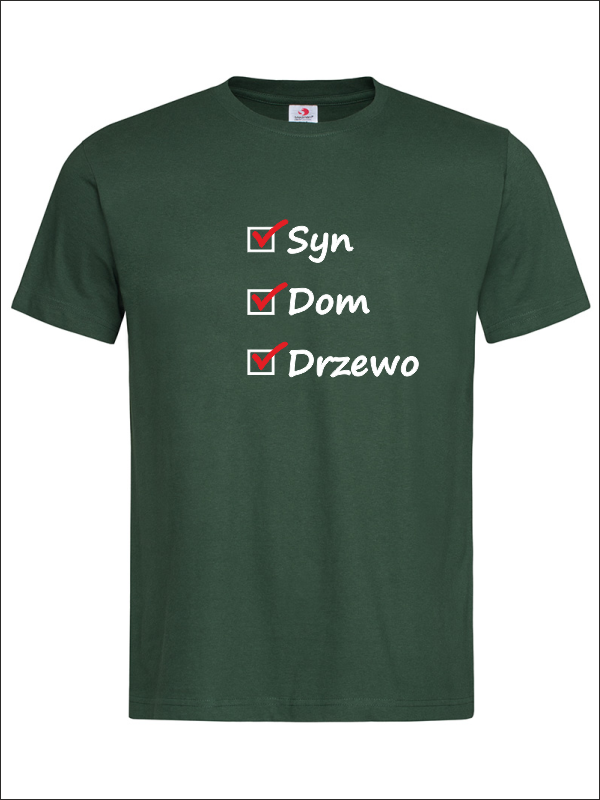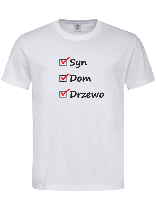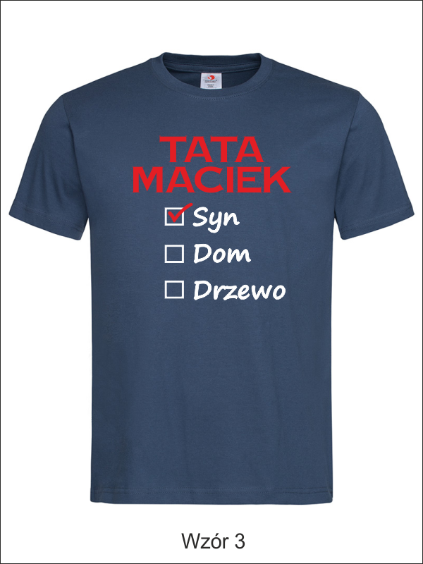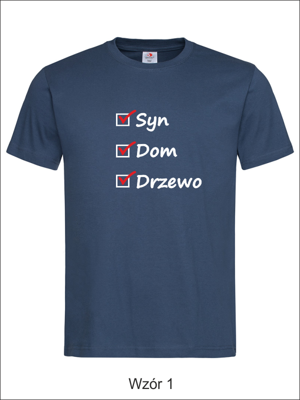 Na przodzie koszulki wykonany jest nadruk znaczników i haseł dla Taty - "Syn, Dom, Drzewo".