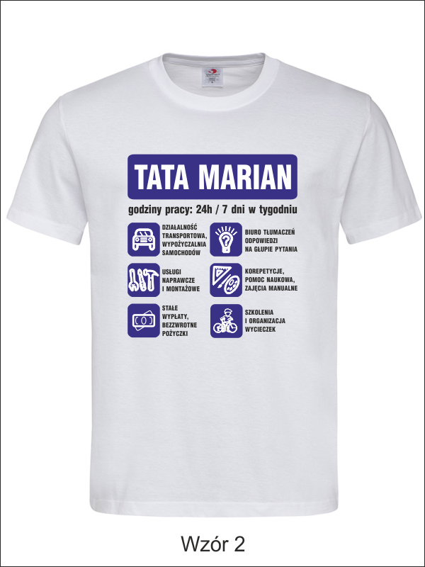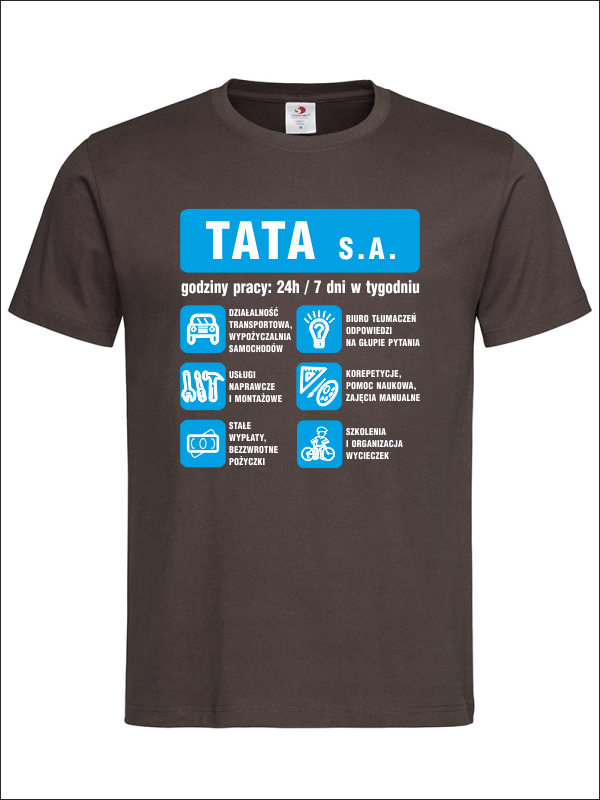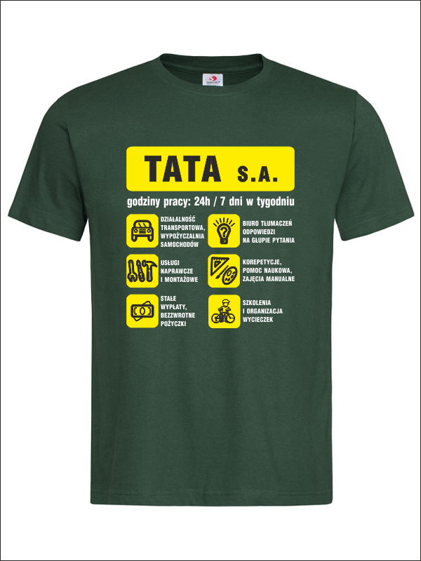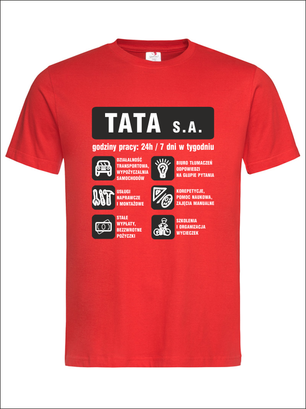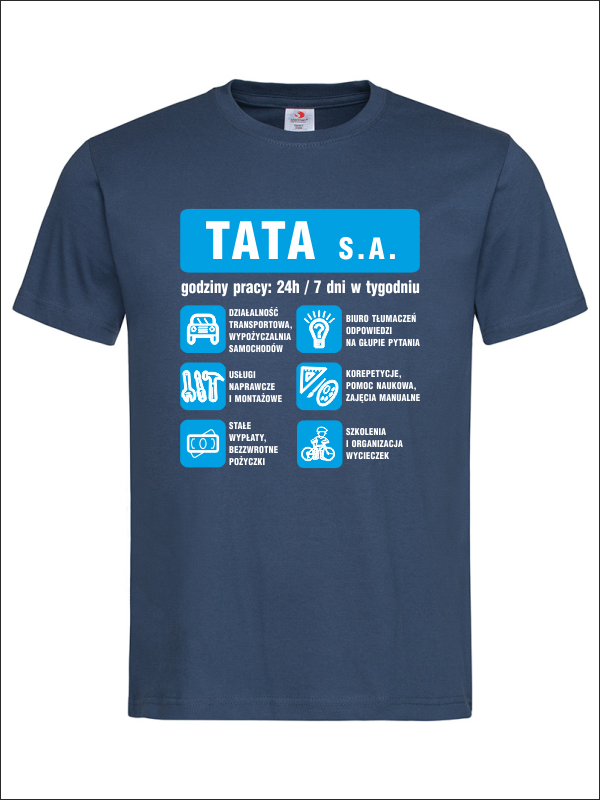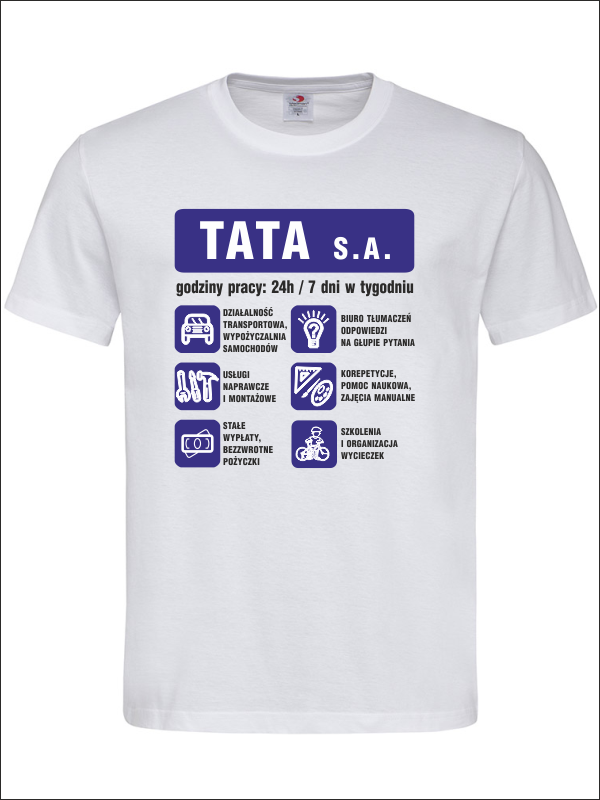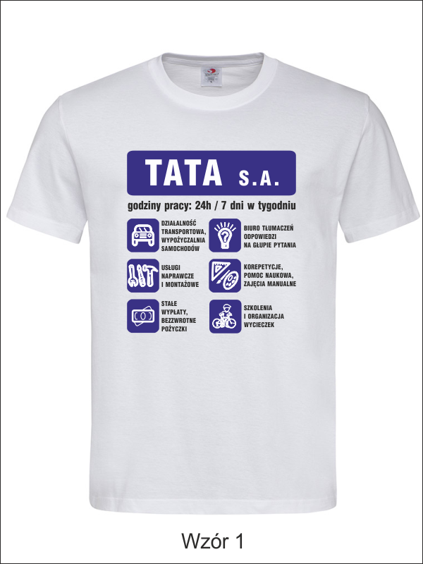 Na przodzie koszulki wykonany jest nadruk piktogramów i żartobliwej dedykacji dla Taty - "Tata SA".
