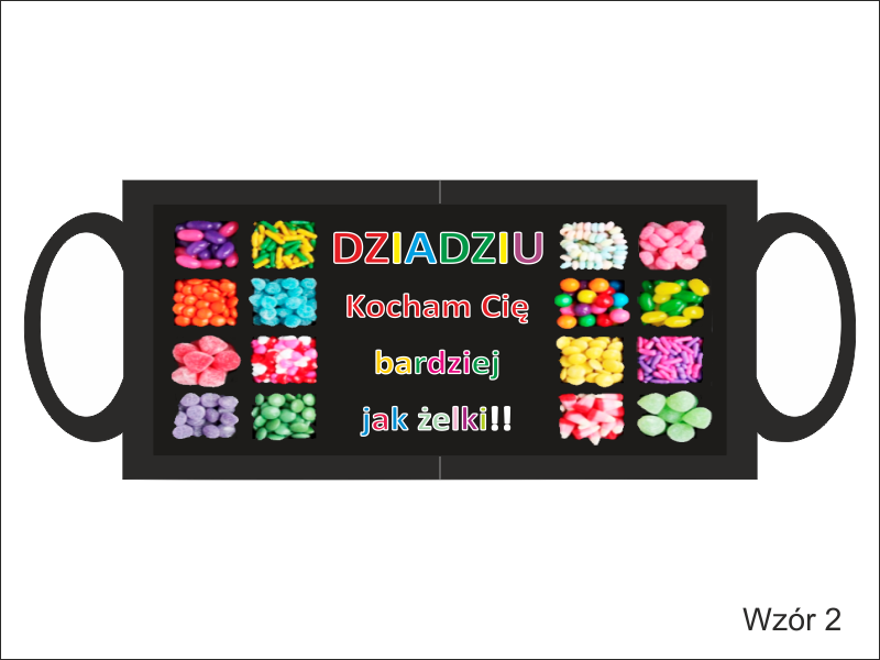 Nadruk dedykacji na kubku jest dowolny i można wykorzystać jeden z wzorów lub wykonać wg indywidualnych ustaleń.
