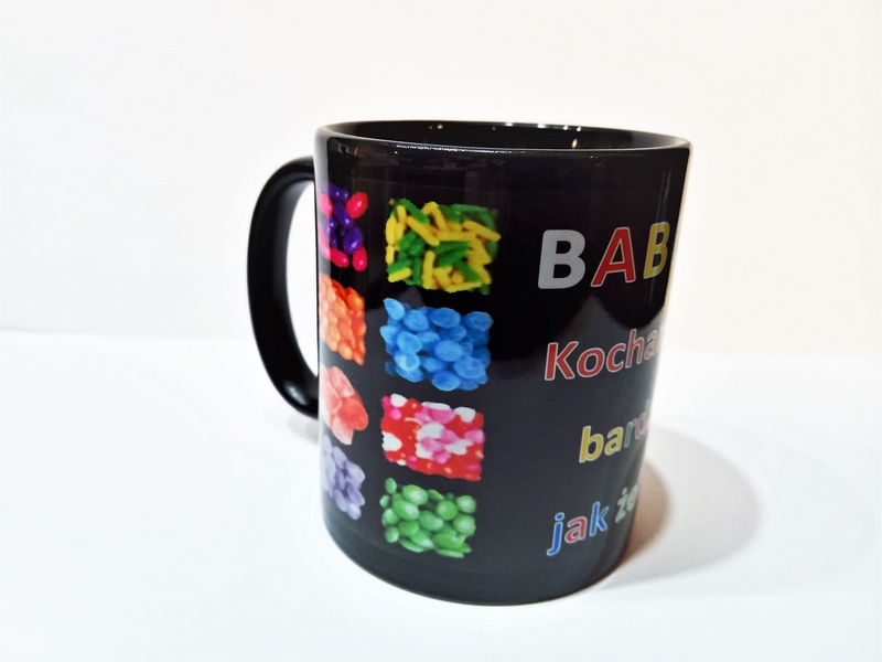 Upominek dla Babci i Dziadka w postaci czarnego kubka z okienkiem do nadruku.