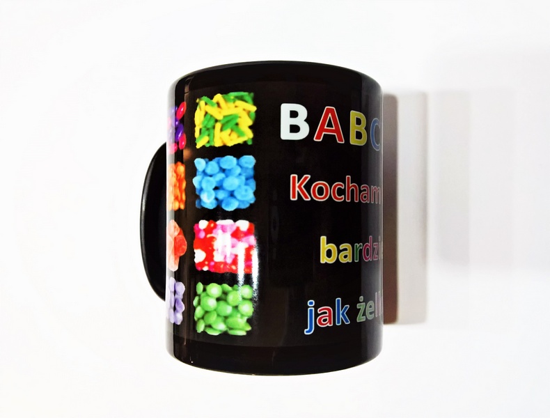 Powierzchnia kubka pokryta jest specjalną, przyjmującą nadruk powłoką, dodatkowo utwardzoną, co zapewnia odporność na mycie w zmywarce.