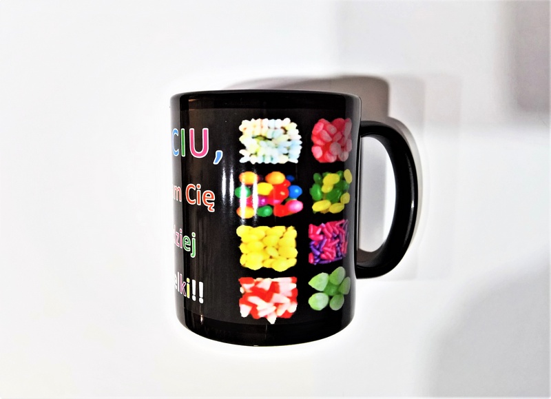 Na kubku można wykonać pełnokolorowy nadruk dedykacji, grafik lub zdjęcia.