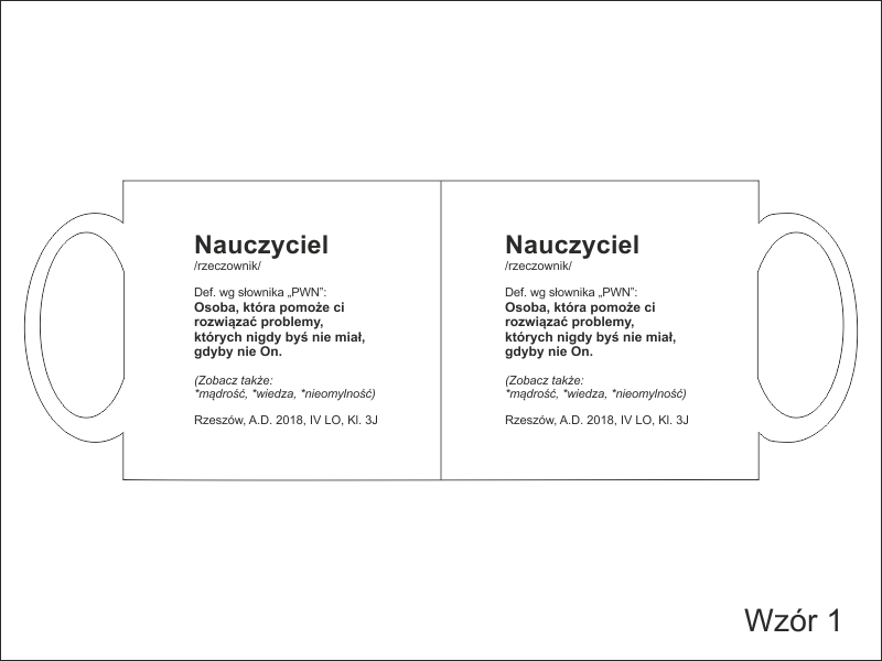 Nadruk dedykacji na kubku jest dowolny i można wykorzystać jeden z wzorów lub wykonać wg indywidualnych ustaleń.