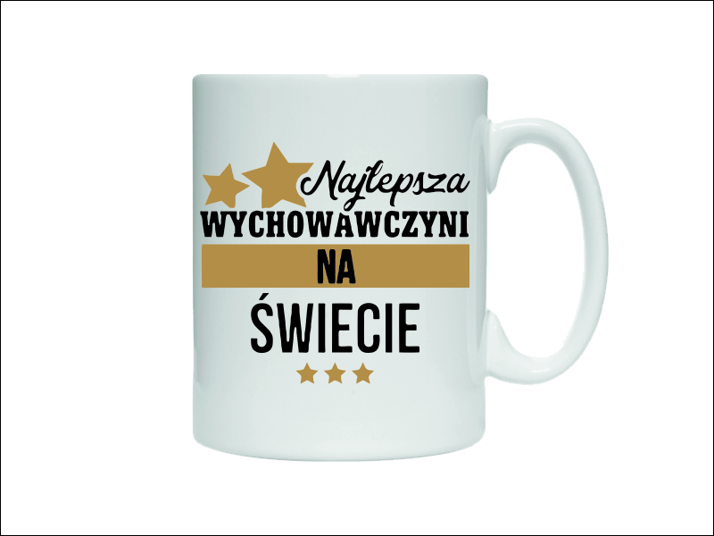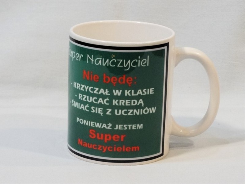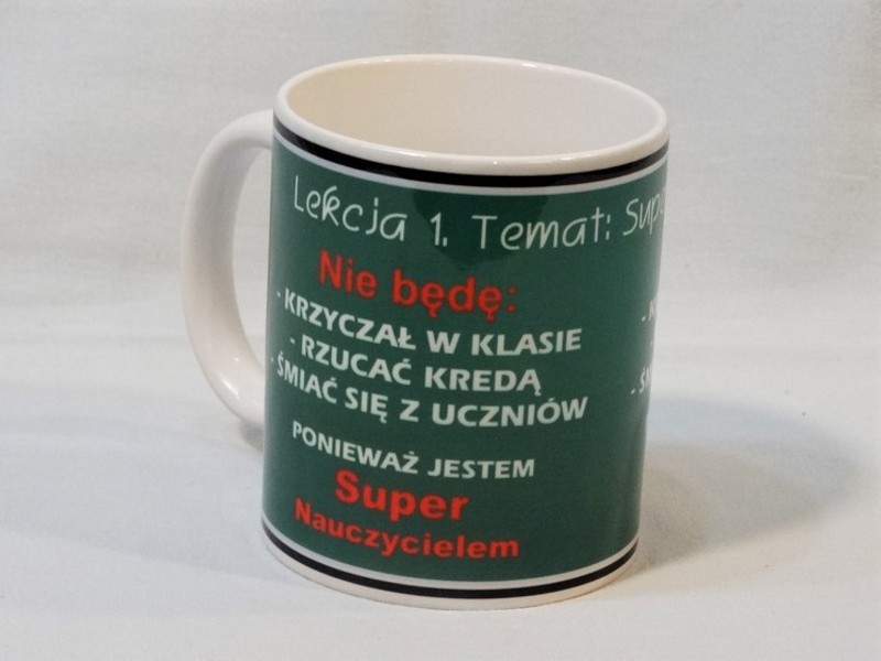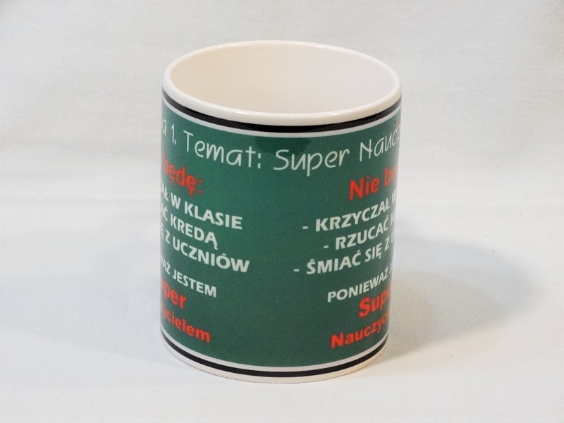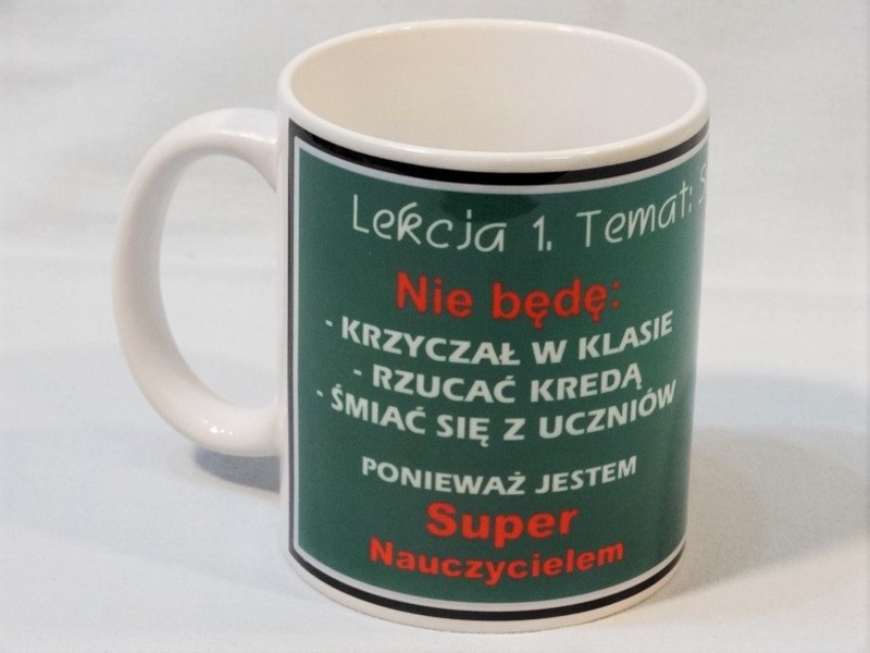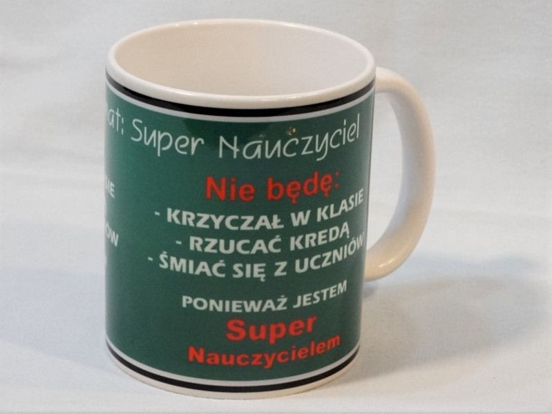 Na kubku można wykonać pełnokolorowy nadruk dedykacji, grafik lub zdjęcia dedykowany dla Nauczyciela.