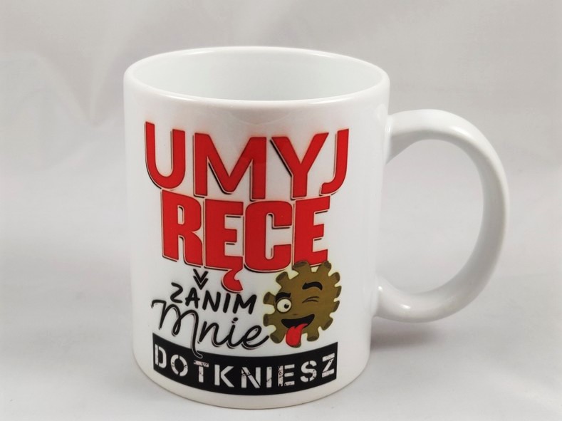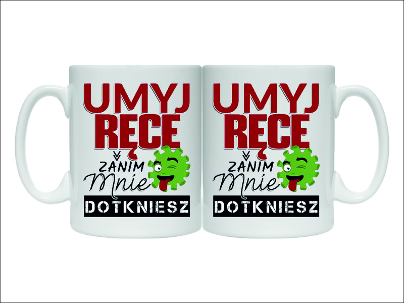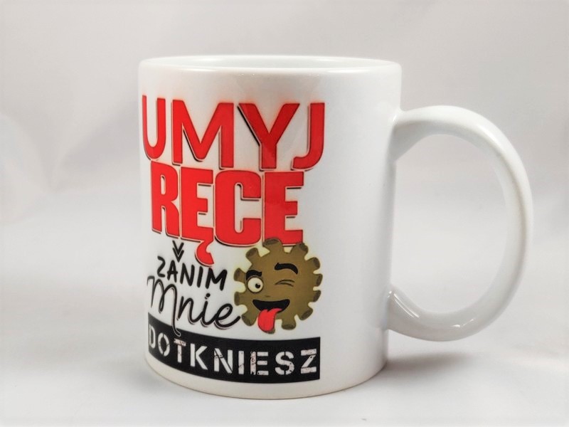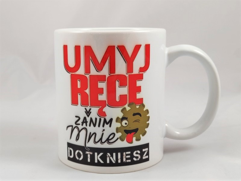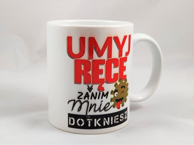Na kubku wykonany jest nadruk napisu "Umyj ręce zanim mnie dotkniesz".