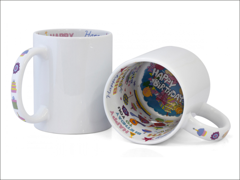 Powierzchnia kubka pokryta jest specjalną, przyjmującą nadruk powłoką, dodatkowo utwardzoną, co zapewnia odporność na mycie w zmywarce.