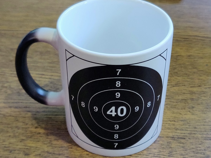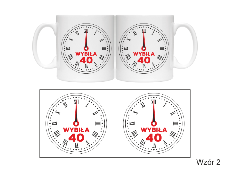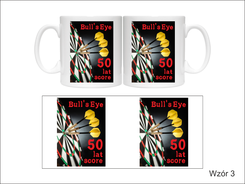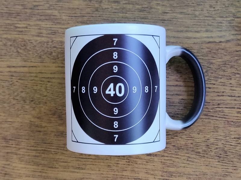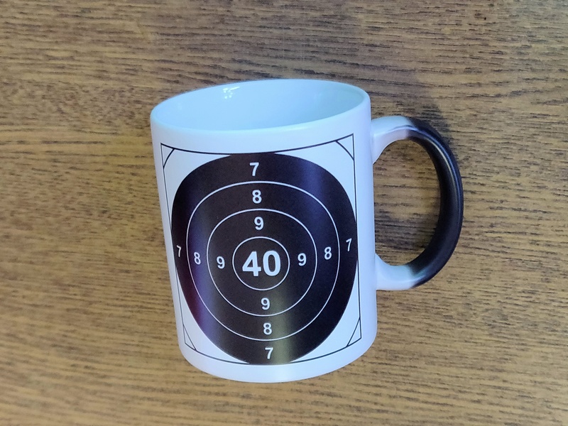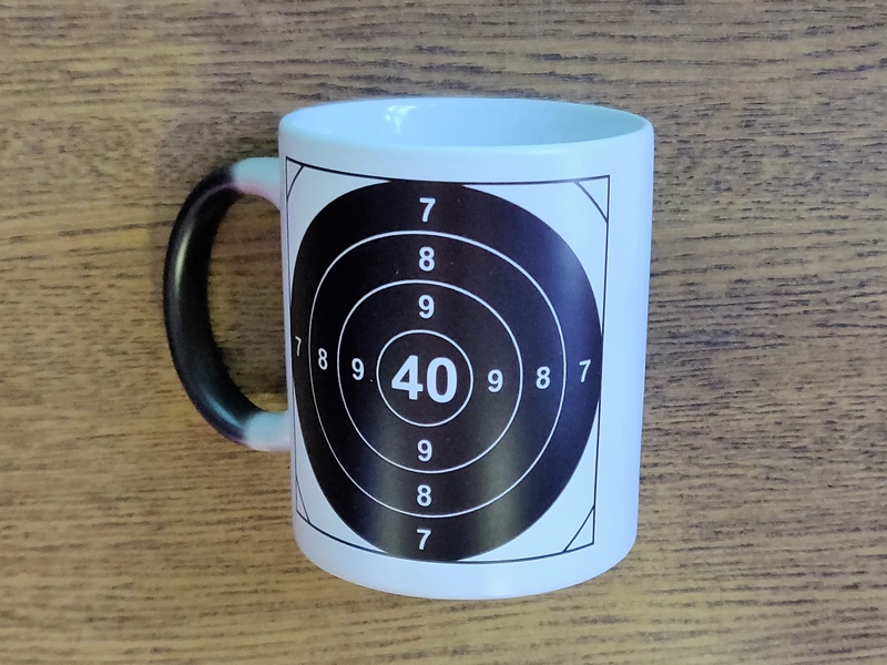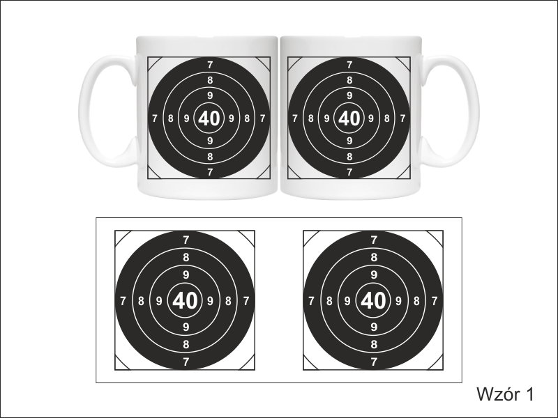 Na kubku wykonany jest nadruk w postaci Tarczy strzelniczej z centralnie umieszczonym wiekiem Jubilata.