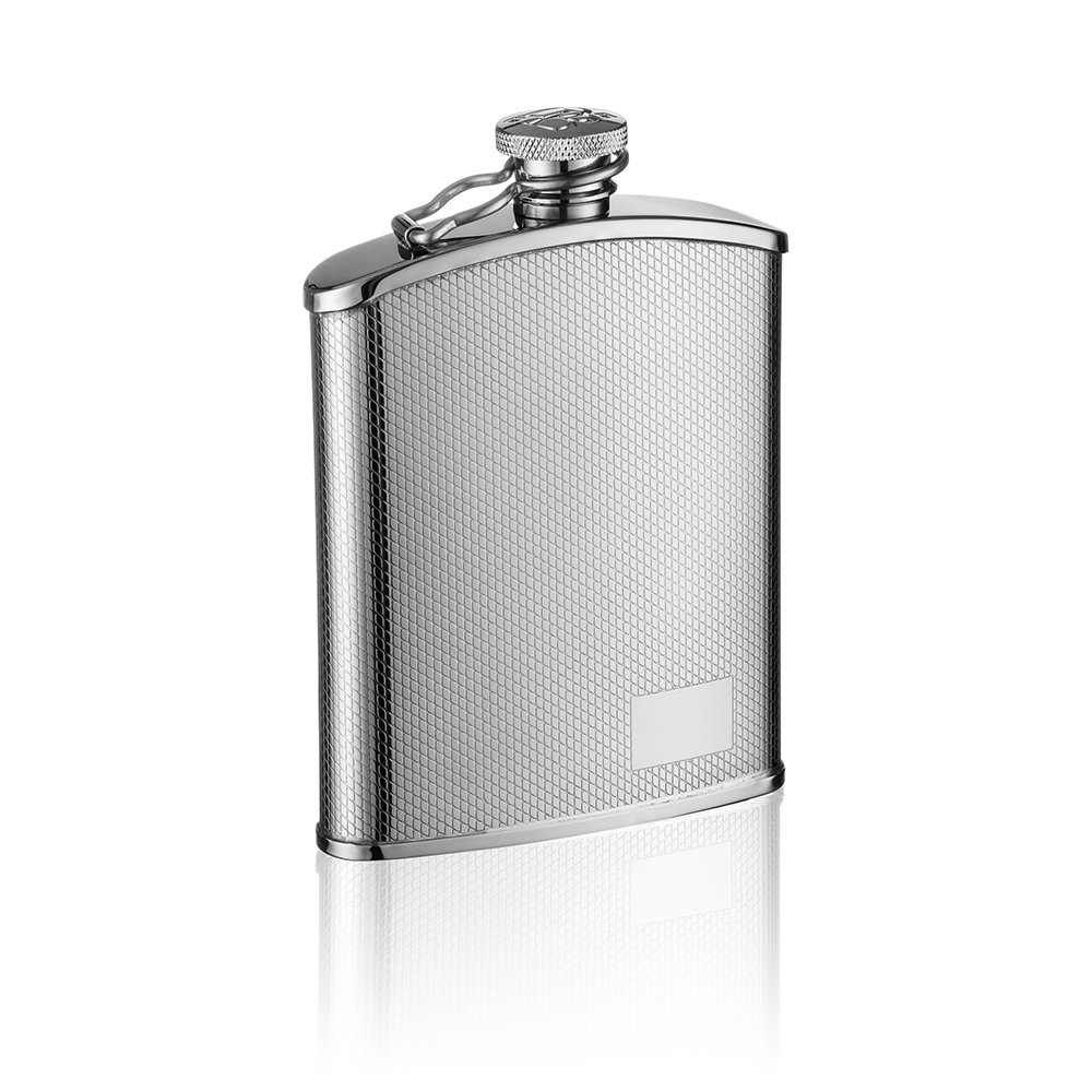 Piersiówka stalowa z rantem o pojemności 180 ml, z deseniem w postaci delikatnej kratki z okienkiem na grawer.
