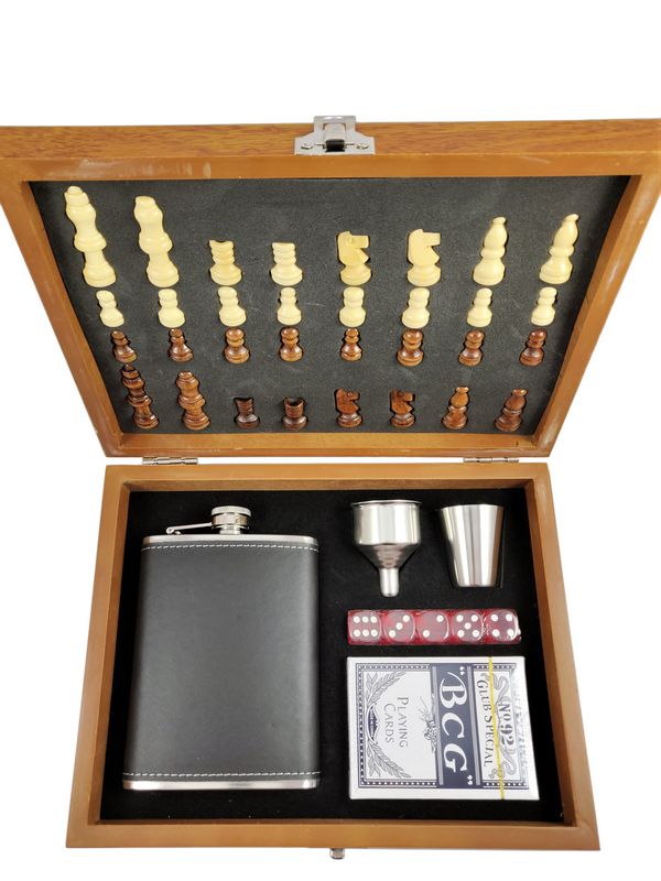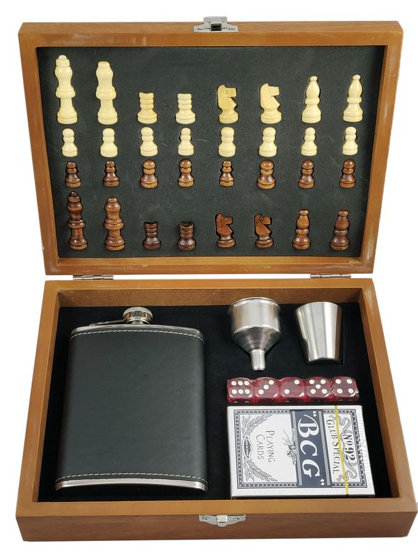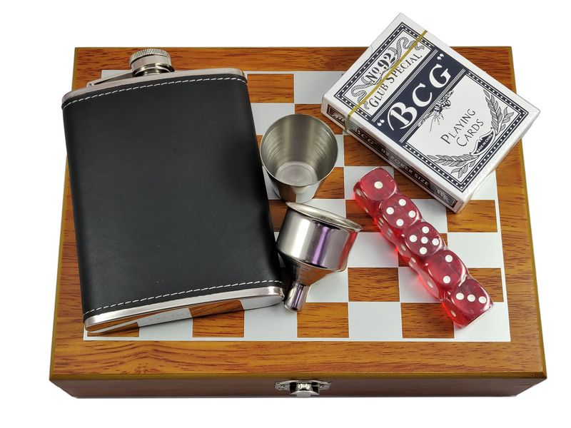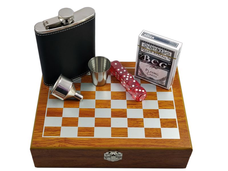 Prezentowy zestaw upominkowy z piersiówą, szachami, kośćmi i kartami do gry.