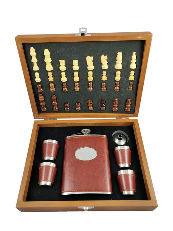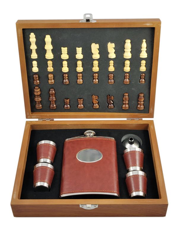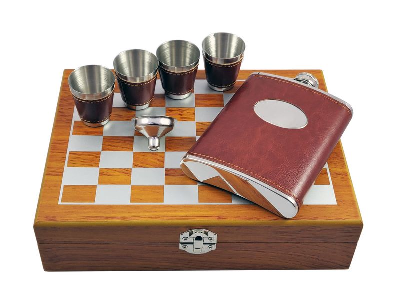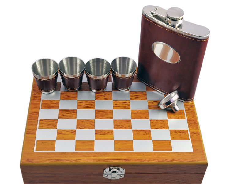 Zestaw upominkowy z piersiówą, kieliszkami i szachami.