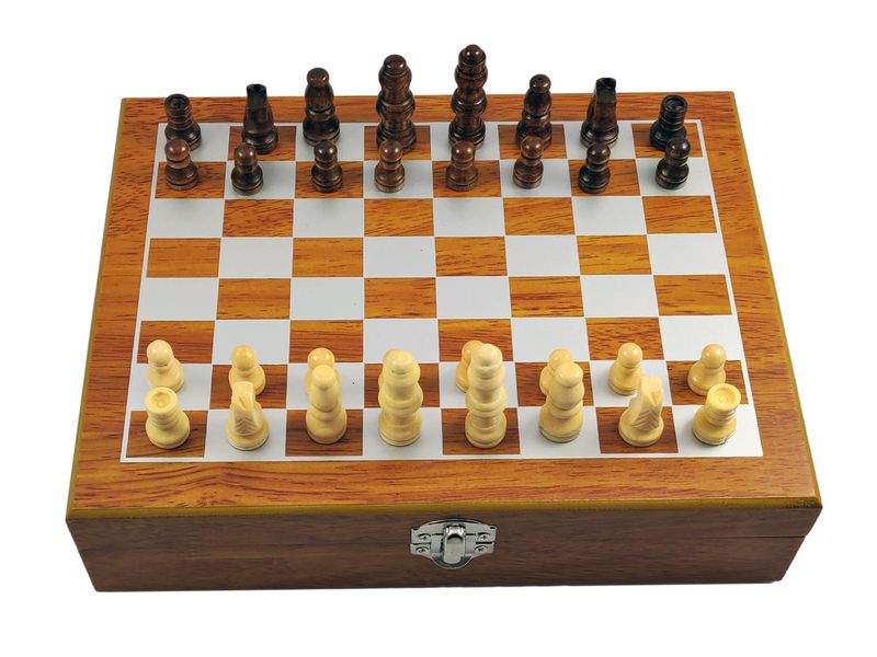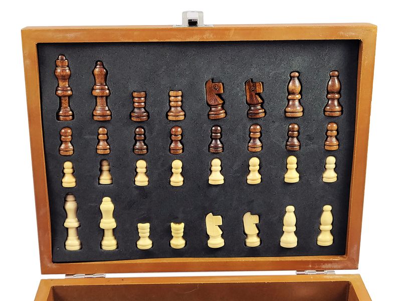 Całość umieszczona jest w drewnianym pudełku - szachownicy.