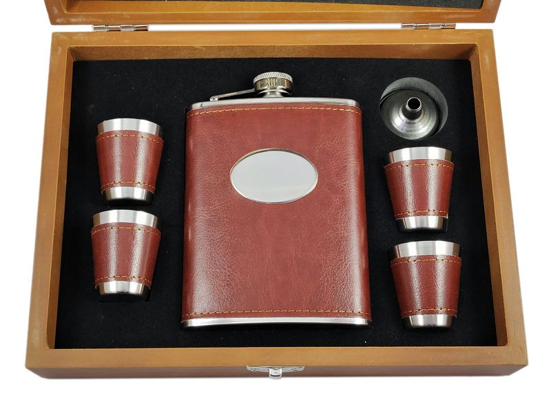 Zestaw składa się z piersiówki wykończonej brązową ekoskórą, czterech kieliszków i lejka.