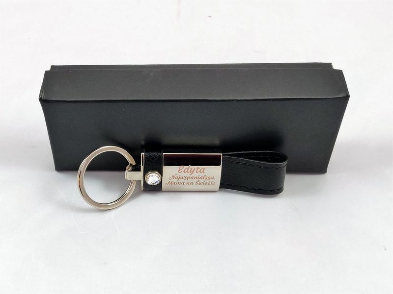 Na breloczku istnieje możliwość dwustronnego graweru na skórzanym pasku lub metalowej obejmie.