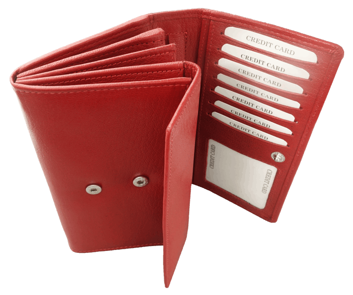 Skórzany portfel damski z wszystkimi podstawowymi funkcjami i kieszeniami na bilon, banknoty, karty, zdjęcia i dokumenty.