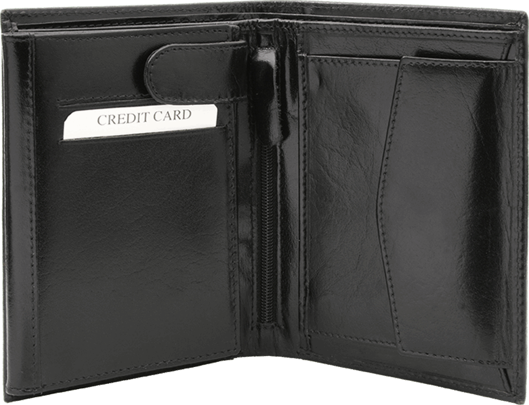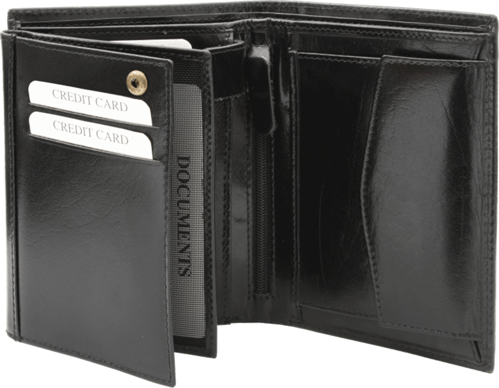 Klasyczny męski skórzany portfel z wszystkimi podstawowymi funkcjami i kieszeniami na bilon, banknoty, karty, zdjęcia i dokumenty.