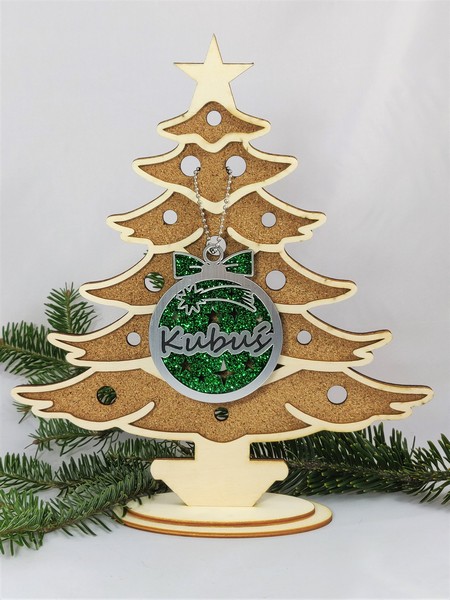 Do bombki można dodatkowo zamówić ozdobny stojaczek w kształcie choinki.