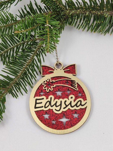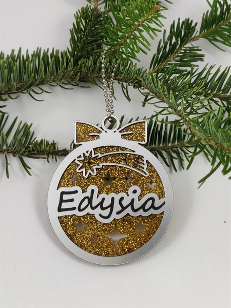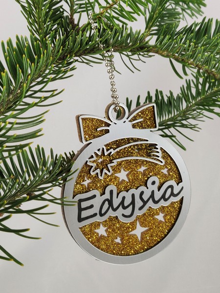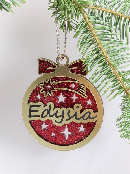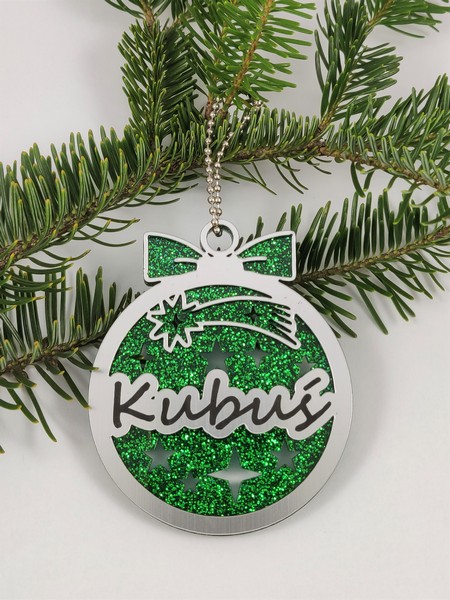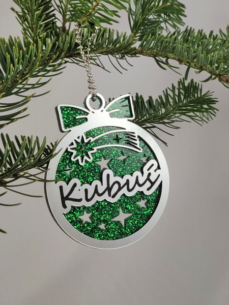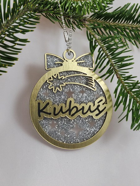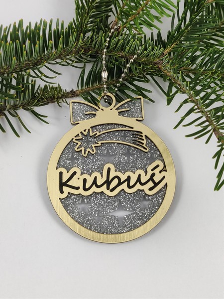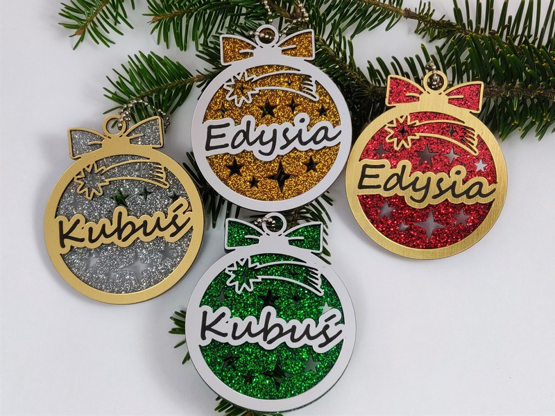 Bombka wykonana jest z dwóch rodzajów materiałów - brokatowej pleksi i laminatu grawerskiego.