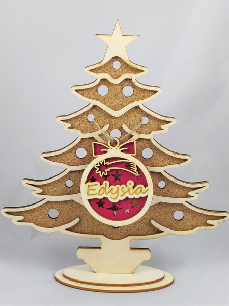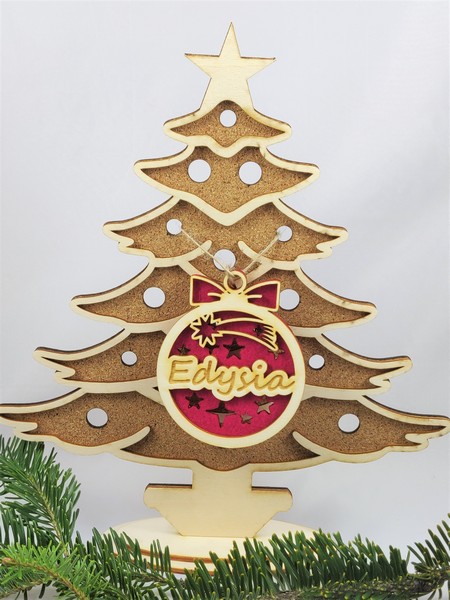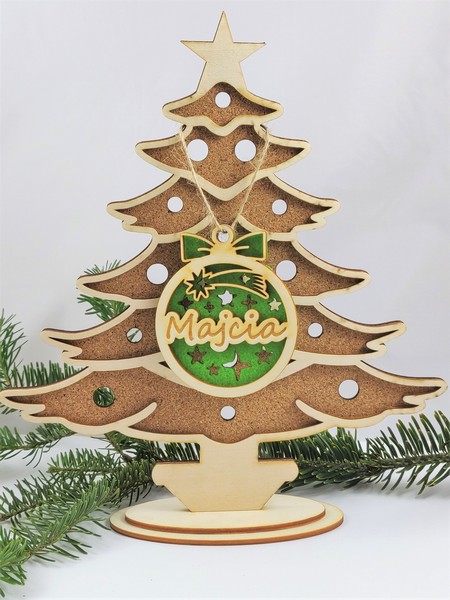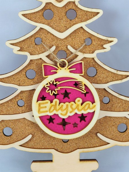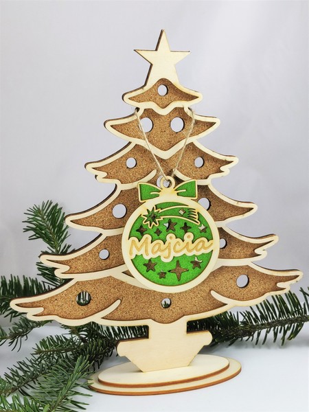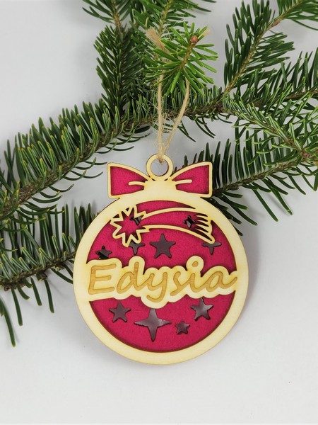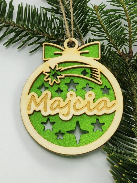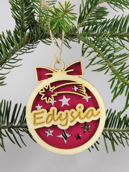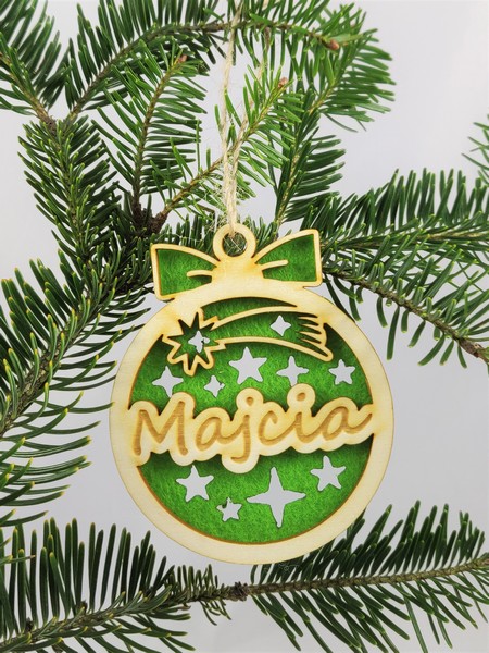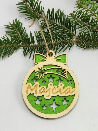 W sklejce umieszczonej z przodu wycięty jest ozdobny kształt bombki z imieniem oraz spadającą gwiazdą.