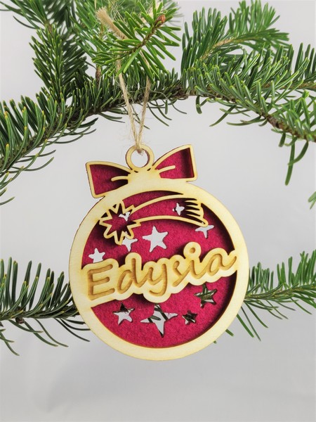 Bombka choinkowa z drewna i filcu z indywidualnym imieniem.