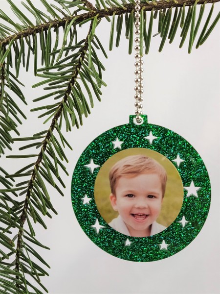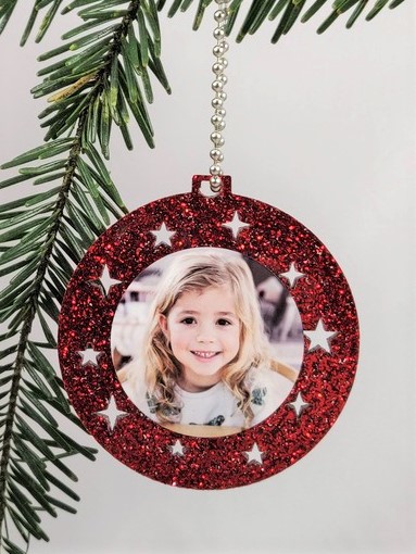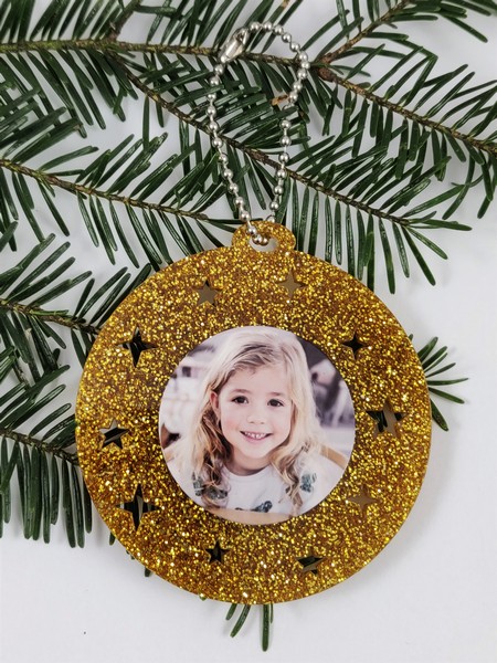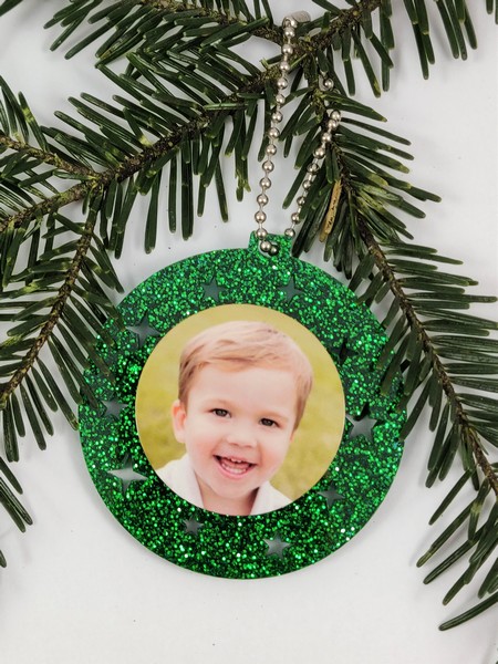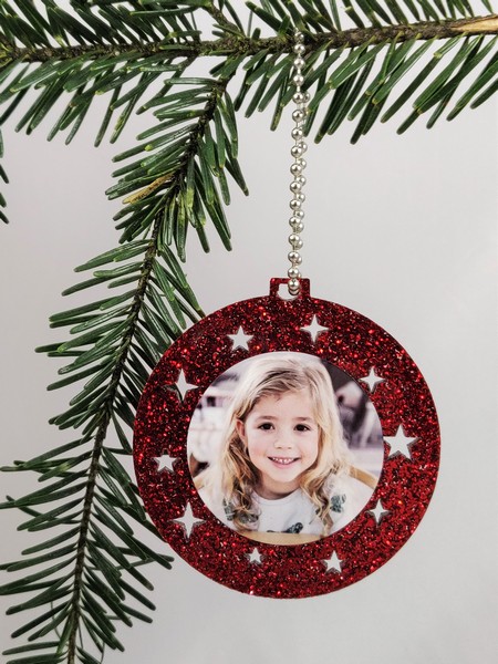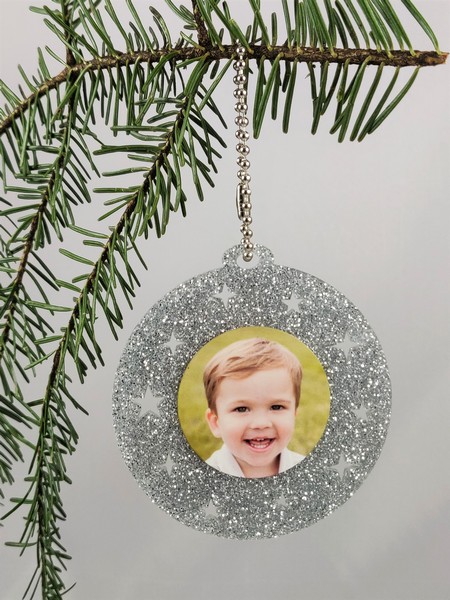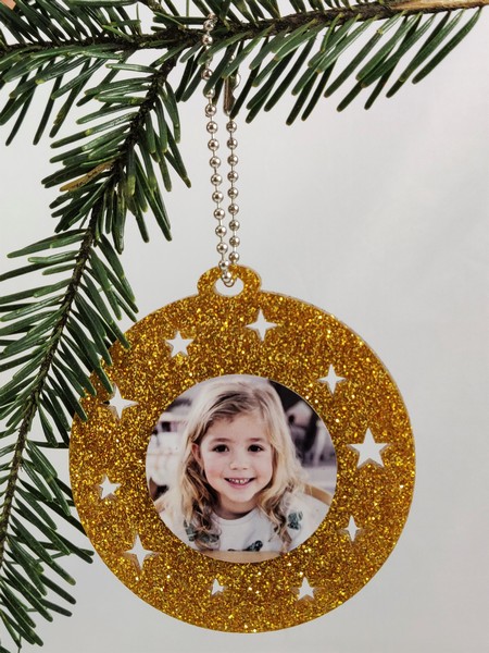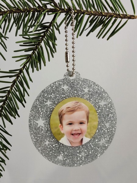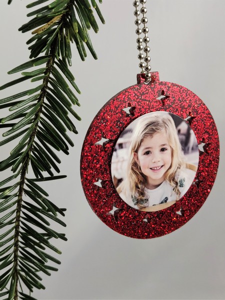 Ozdobna brokatowa bombka choinkowa ze zdjęciem.