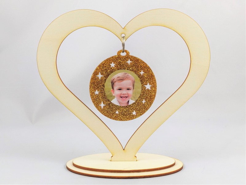 Dodatkowo w zawieszcze po okręgu wycięte są małe ozdobne gwiazdki otaczające kółko, na którym nadrukowane jest pamiątkowe zdjęcie.