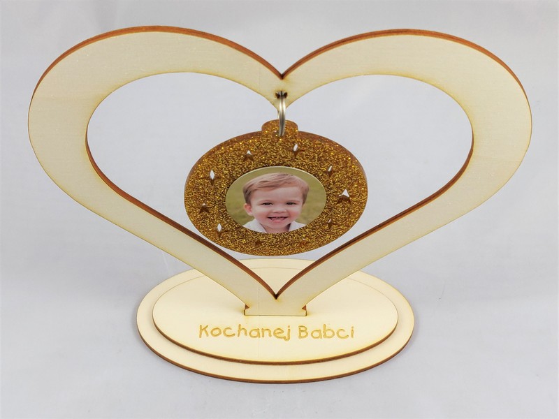 Do bombki można domówić dopasowany stojaczek wycięty ze sklejki w kształcie serca.