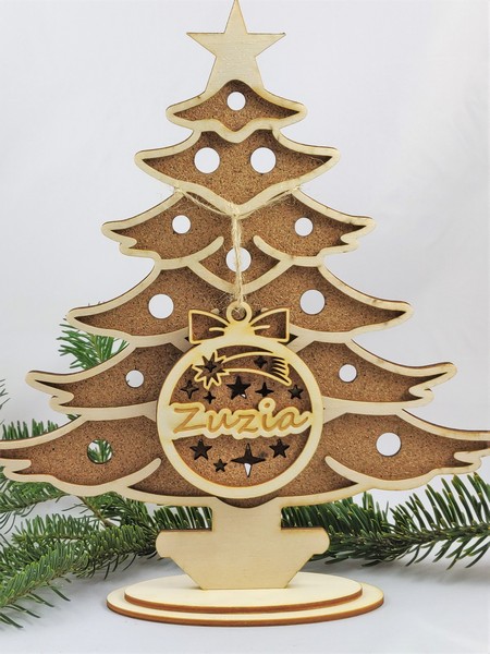 Choinka ma wygląd bożonarodzeniowego drzewka i wykonana jest z naturalnych materiałów: drewna i korka.