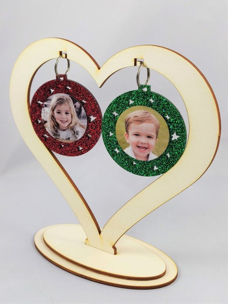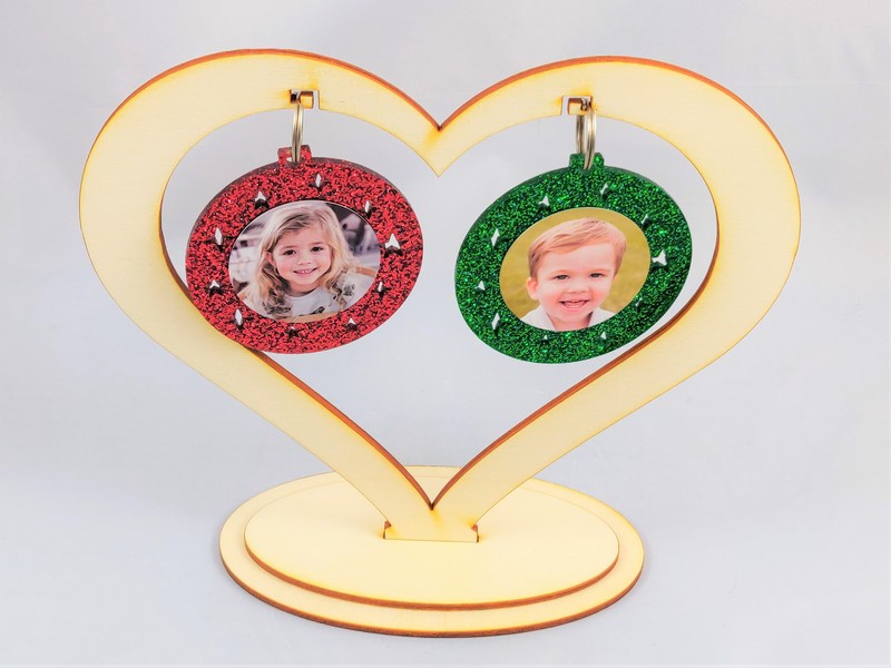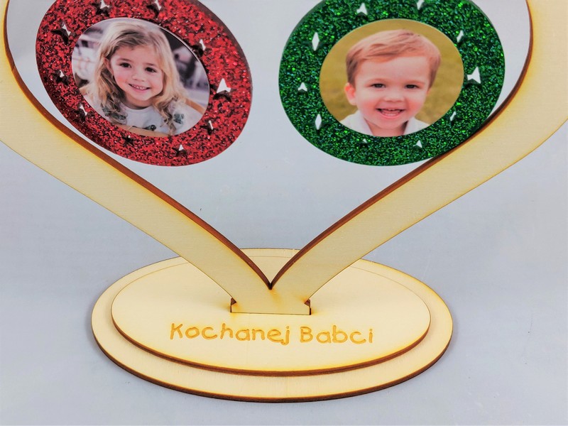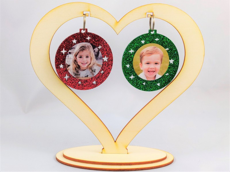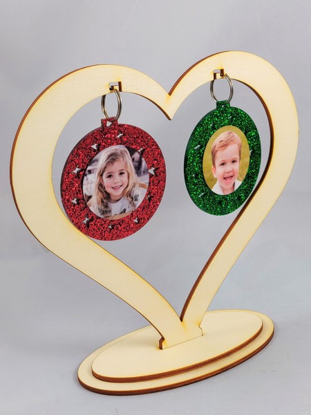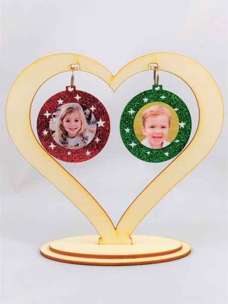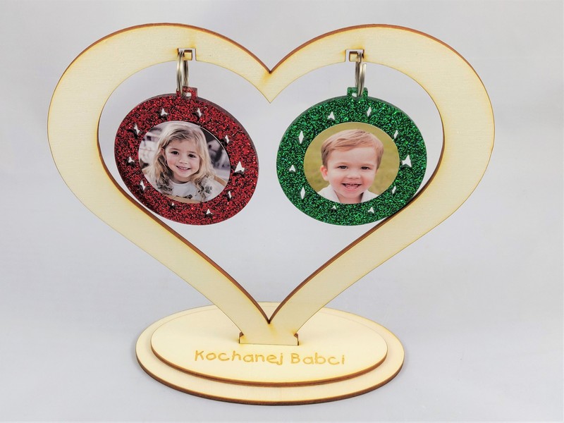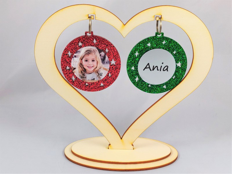 W środku stojaczka zawieszone są dwie brokatowe ozdobna zawieszki w formie bombek ze zdjęciami.