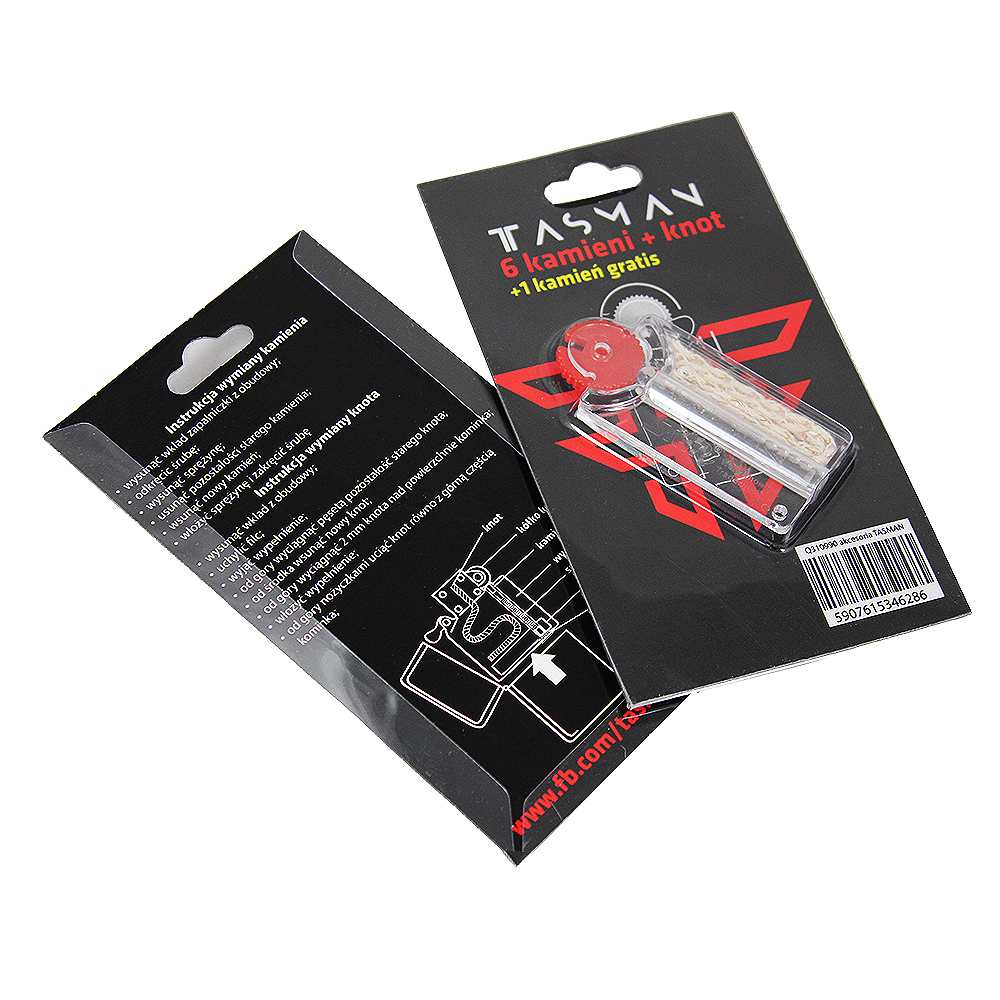 Kamienie i knot do zapalniczek Tasman pakowane w plastikowym dyspenserze