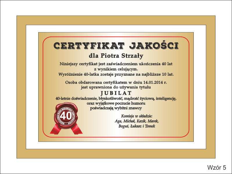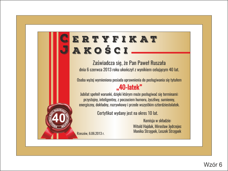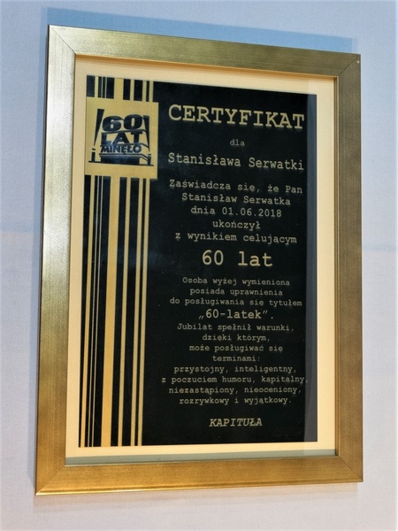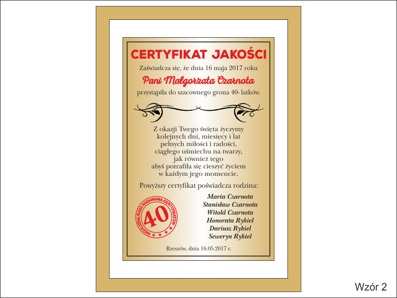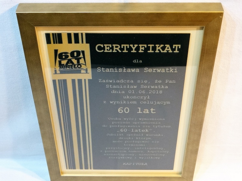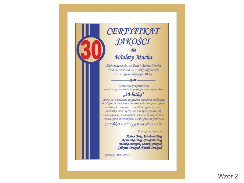 Urodzinowy Certyfikat w postaci dyplomu okolicznościowego w drewnianej ramie za szkłem.
